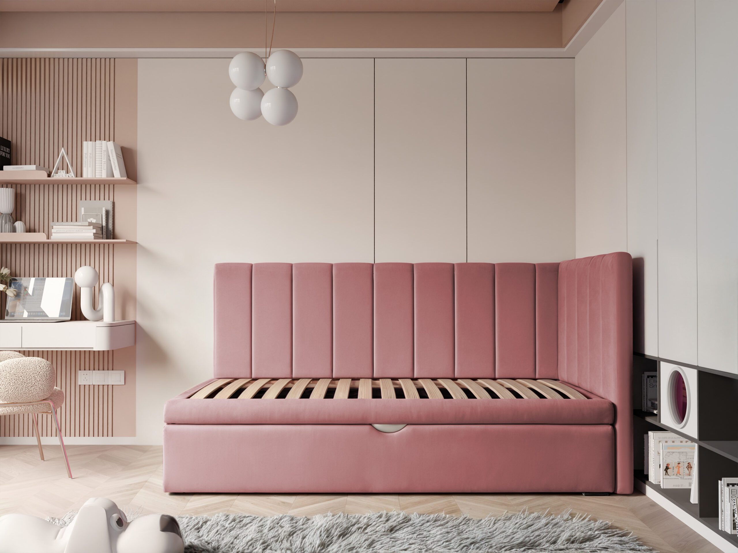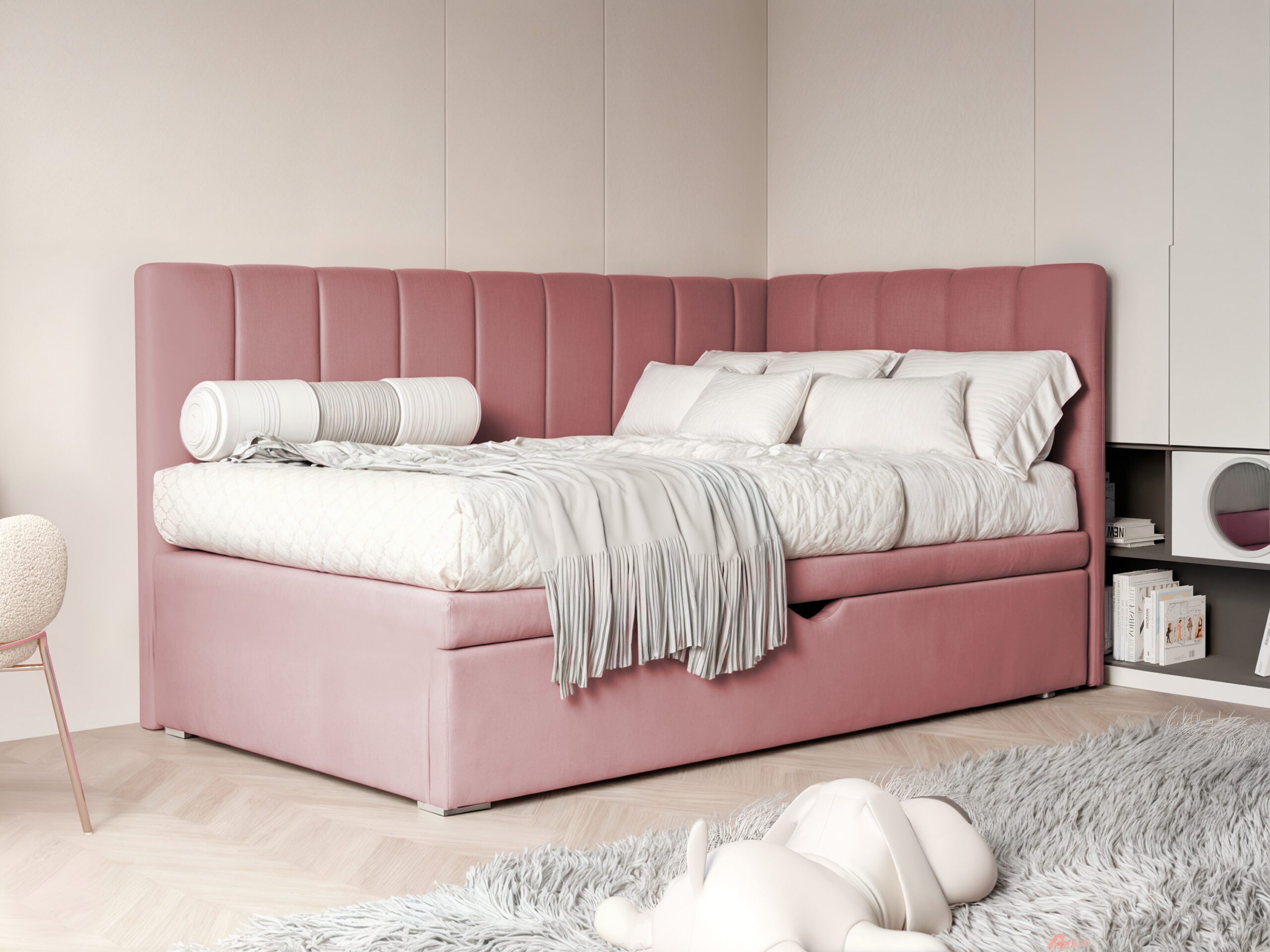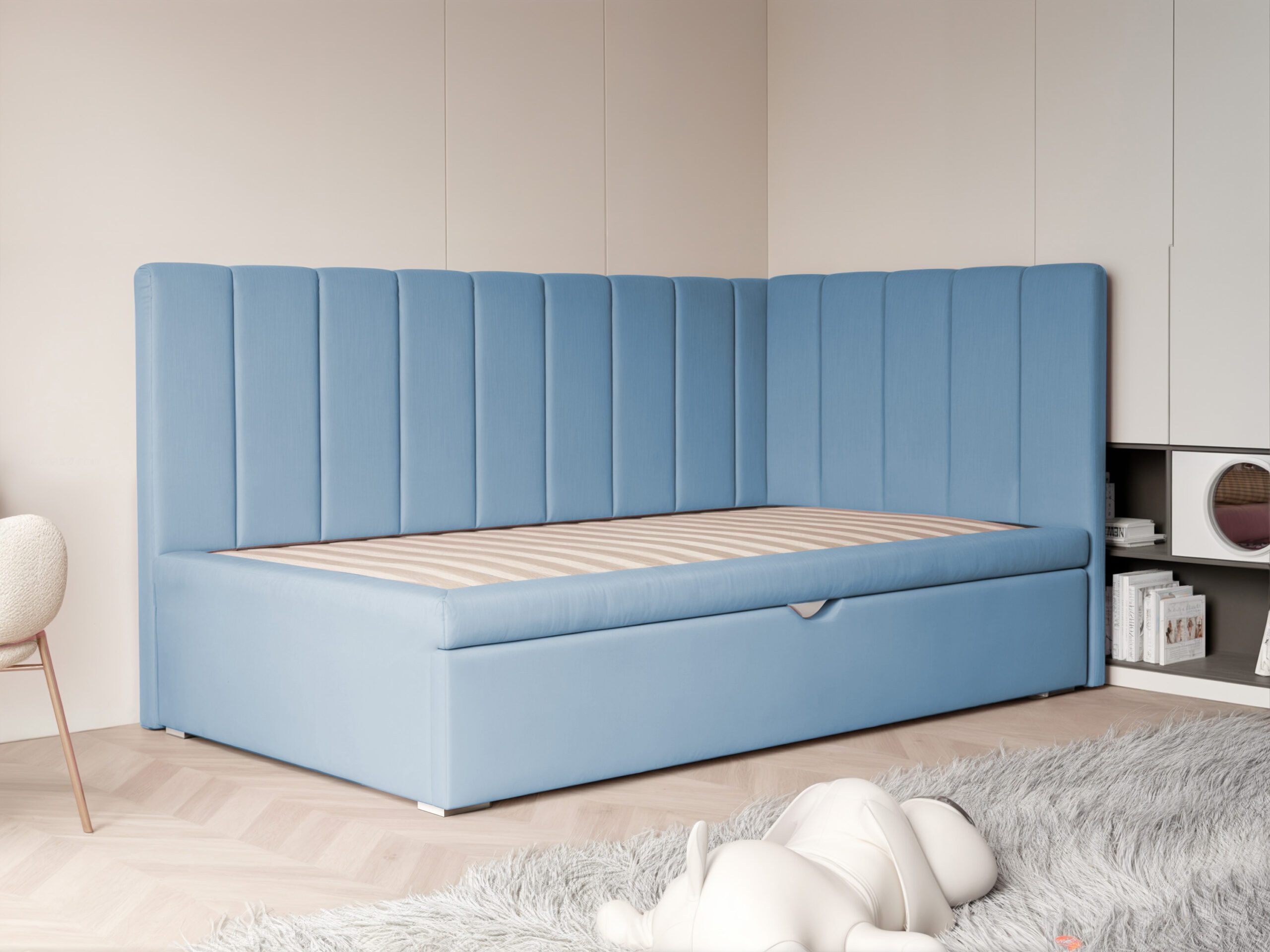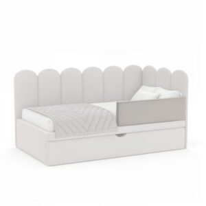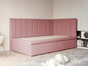 Łóżko Chase to idealne połączenie nowoczesnego designu i codziennej funkcjonalności, stworzone z myślą o komfortowej przestrzeni dla dziecka. Miękkie, tapicerowane wezgłowie oraz boczne oparcie w stylowe paski nadają łóżku wyjątkowego charakteru, jednocześnie tworząc przytulne miejsce do relaksu, lektury czy zabawy.