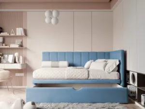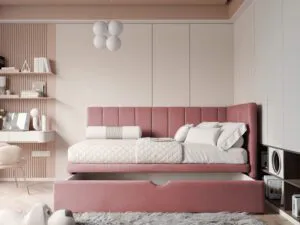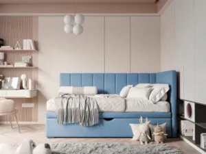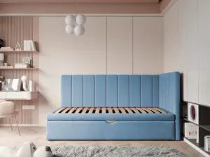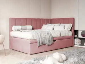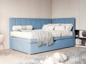 Łóżko wyposażone jest w praktyczną szufladę na pościel, co sprawia, że organizacja przestrzeni staje się łatwiejsza. Wysuwana szuflada pomieści kołdry, poduszki, a także zabawki czy inne drobiazgi, pomagając utrzymać porządek w pokoju