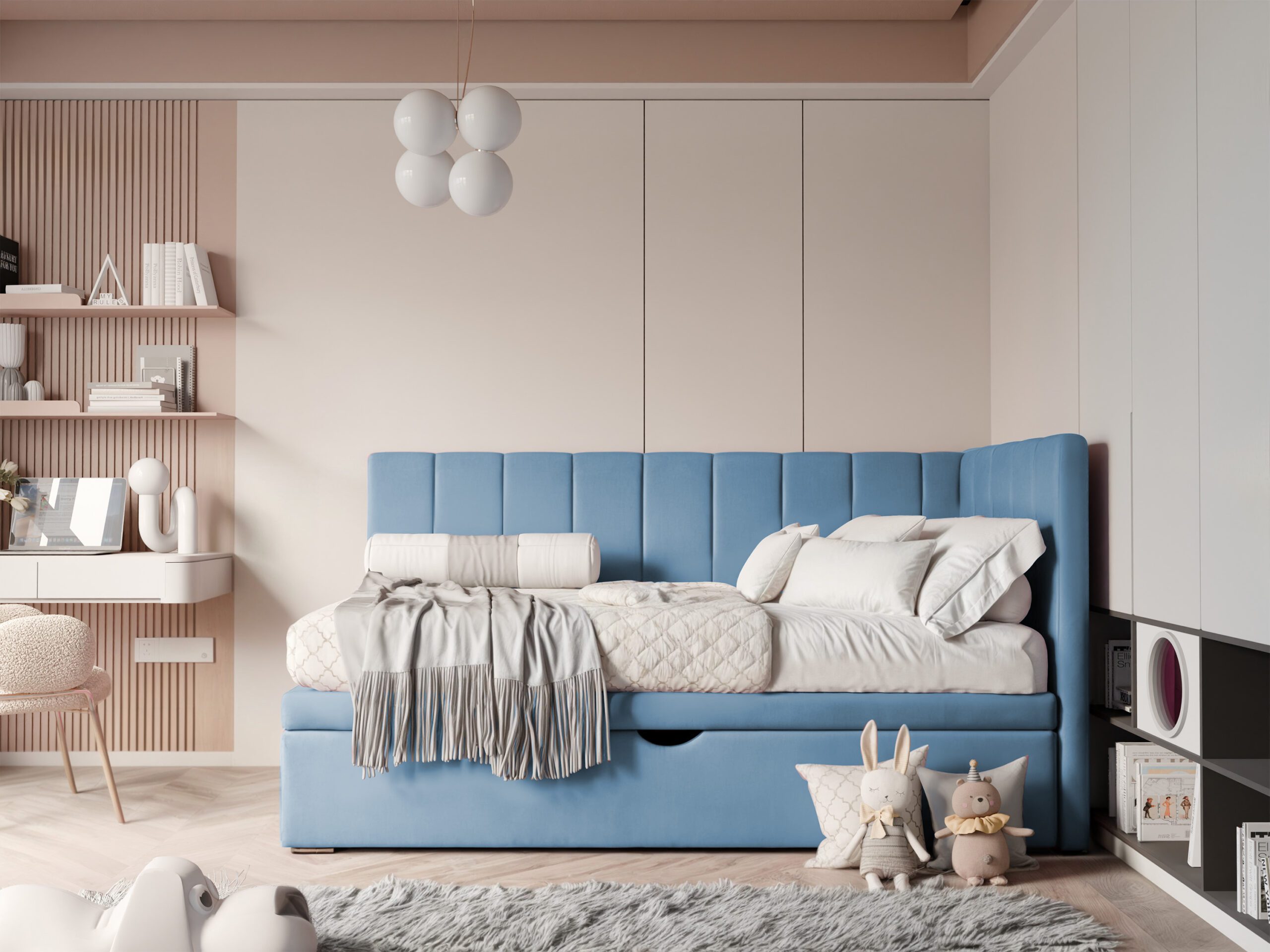 Konstrukcja została zaprojektowana z myślą o dzieciach – bez ostrych krawędzi i z zachowaniem stabilności. Rozwiązania użytkowe zapewniają komfort zarówno podczas snu, jak i codziennej zabawy.