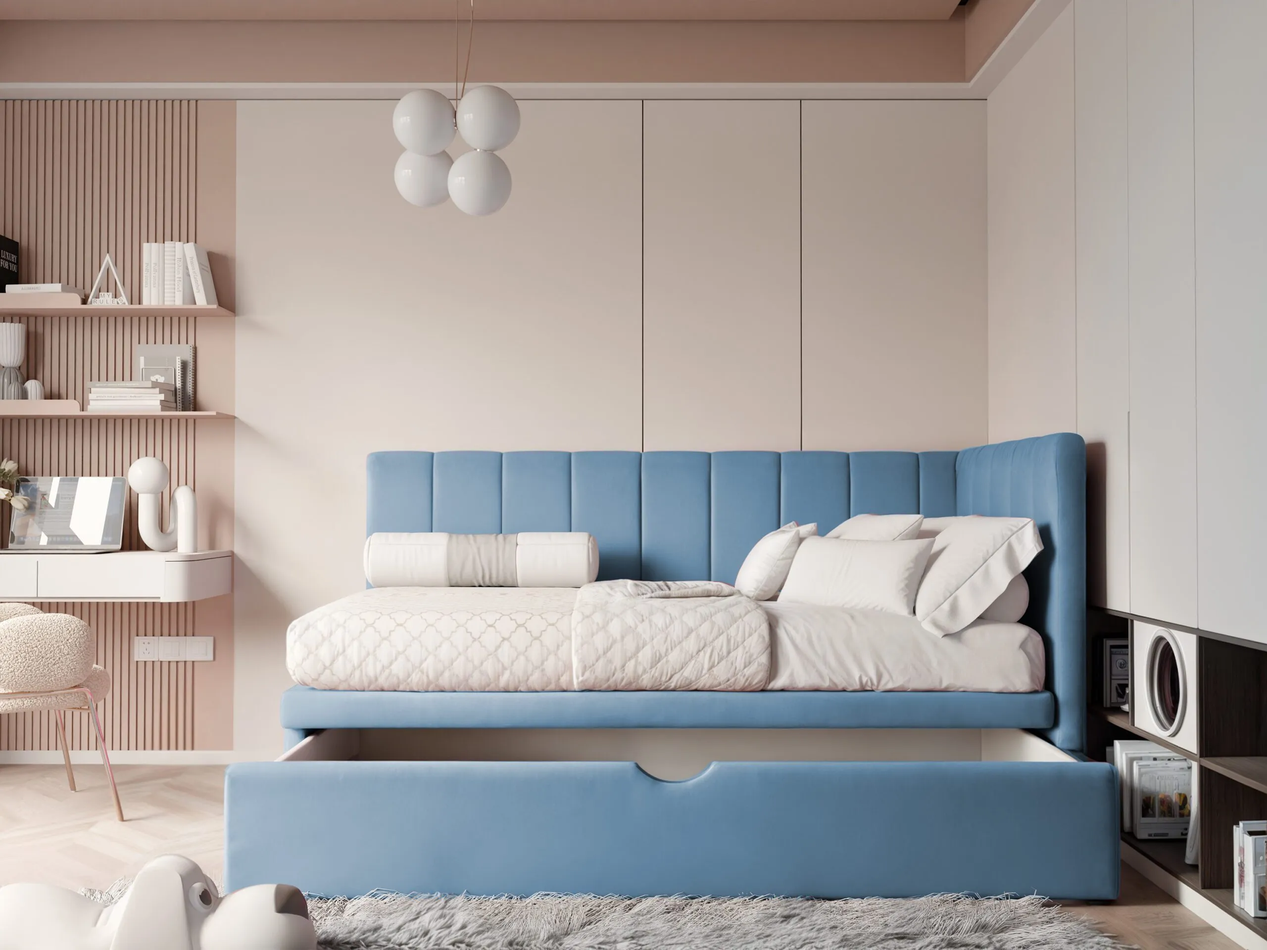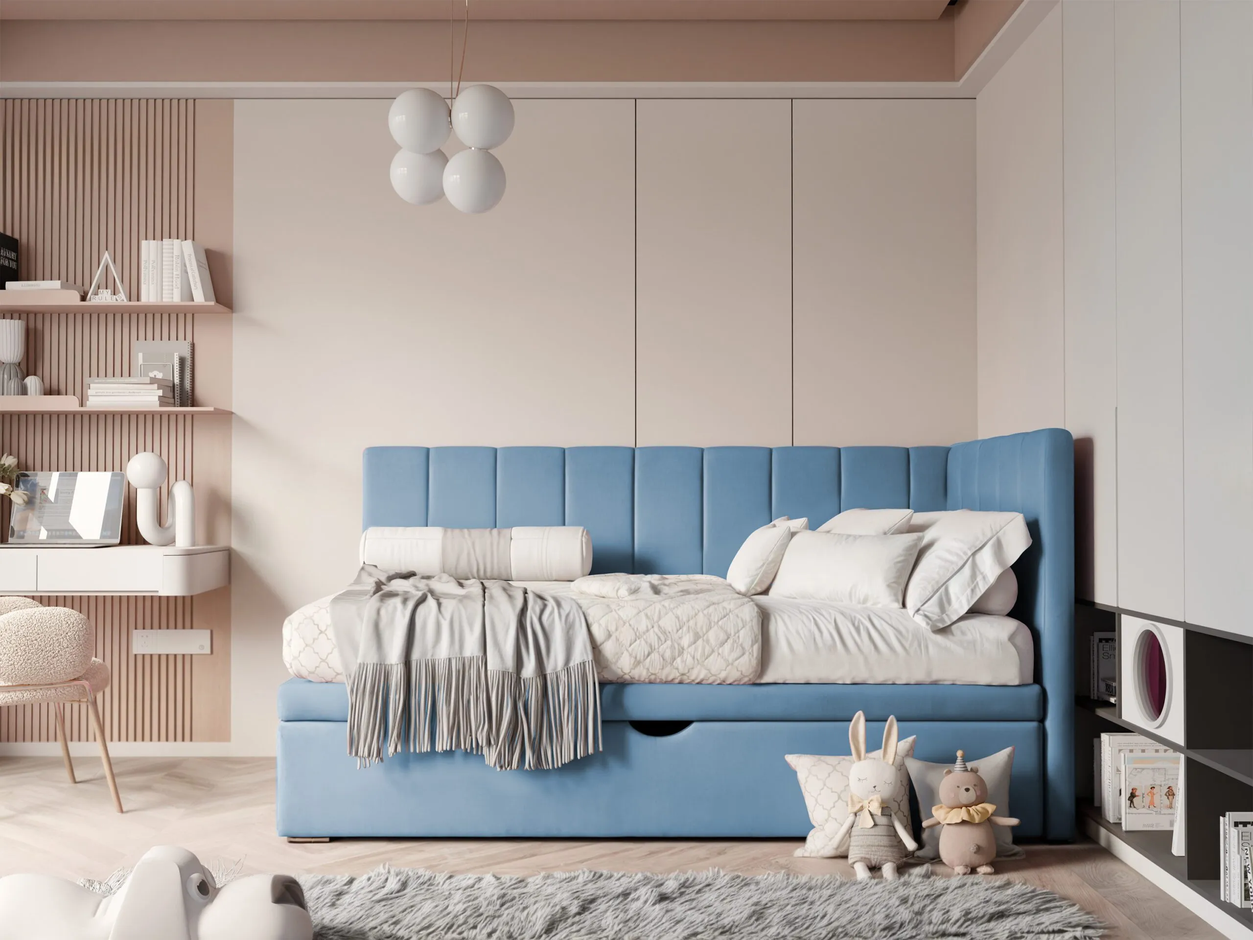 Forma mebla nawiązuje do świata dziecięcej wyobraźni i nadaje wnętrzu przyjazny charakter. Design sprawia, że mebel staje się naturalnym elementem pokoju dziecka, a nie tylko jego wyposażeniem.