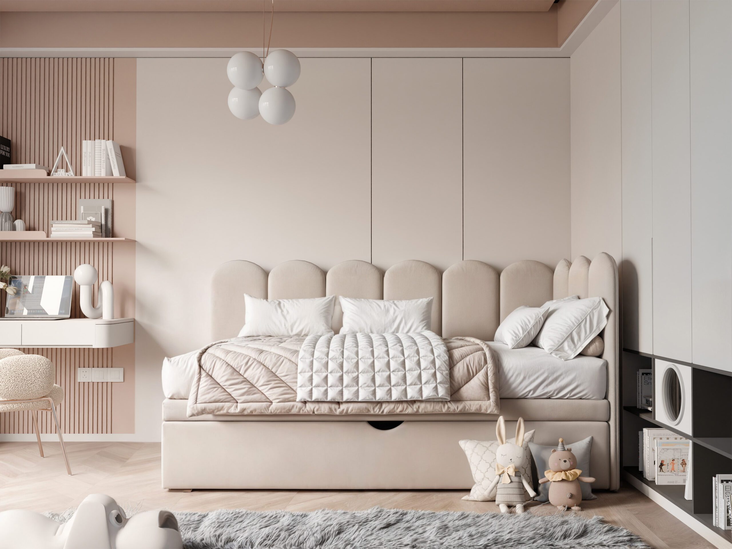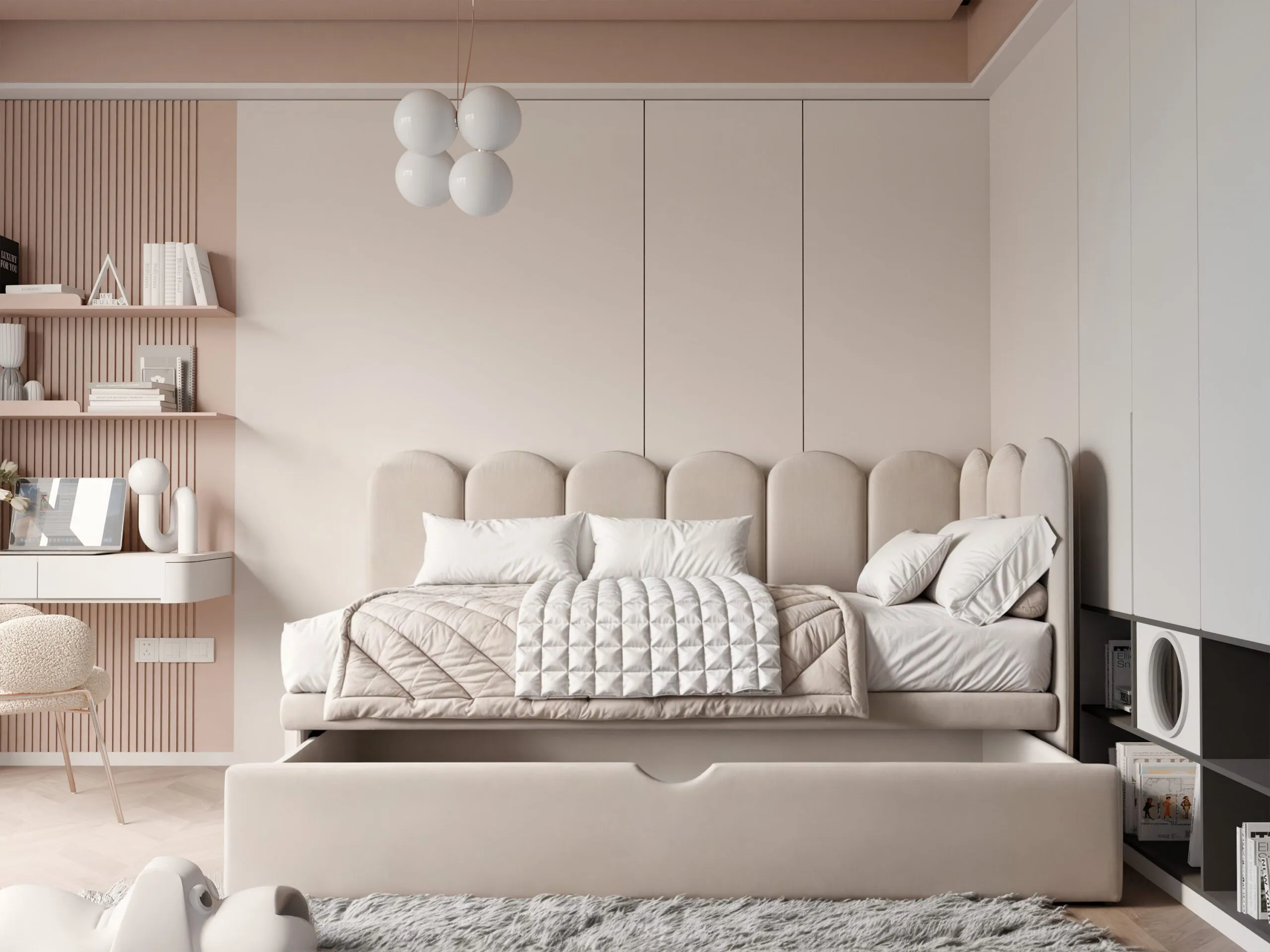 ✅ Praktyczna szuflada na pościel – pojemna przestrzeń pod łóżkiem pomaga w organizacji pokoju, ułatwiając przechowywanie pościeli, ubrań lub zabawek.