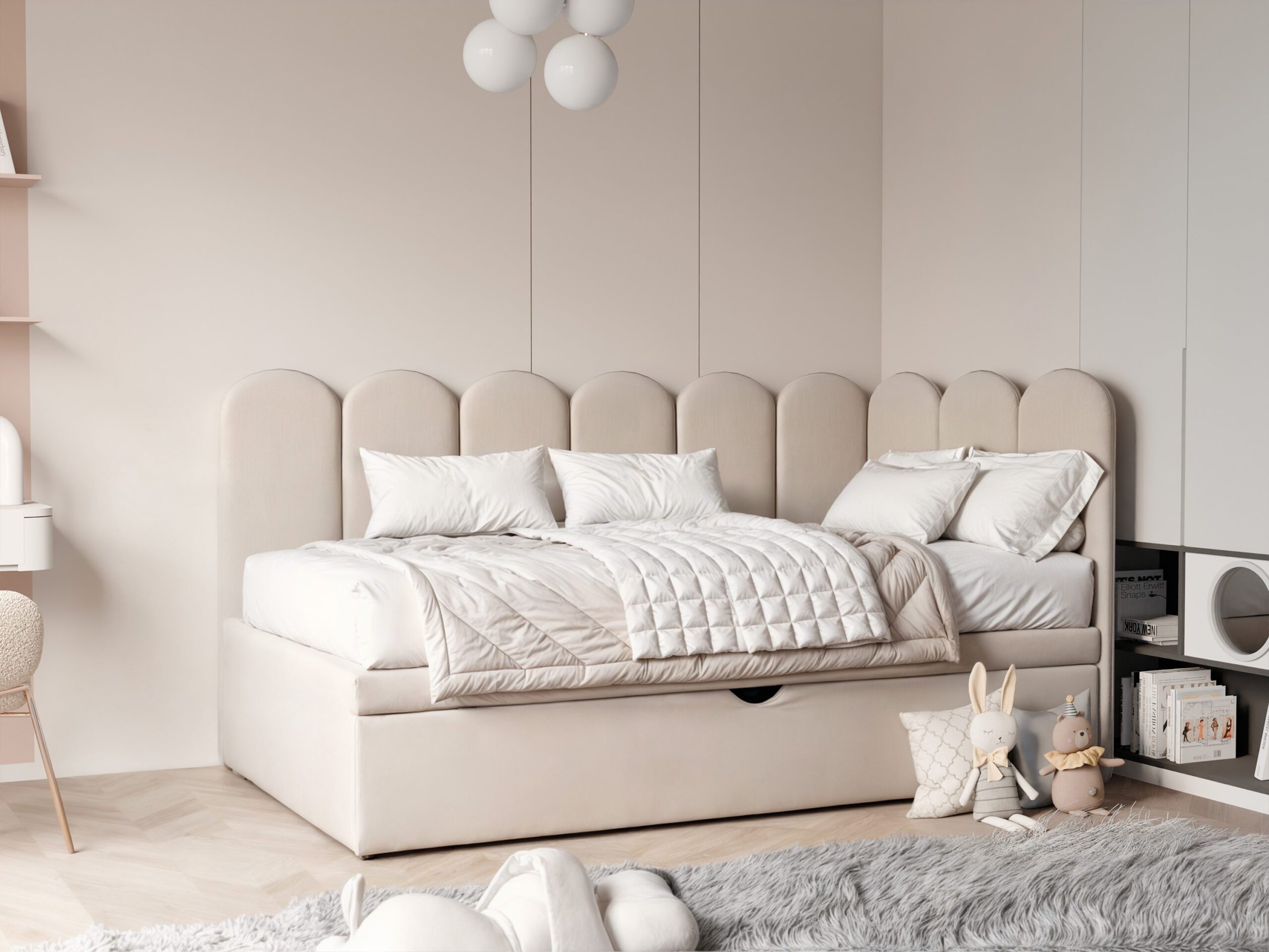 Konstrukcja została zaprojektowana z myślą o dzieciach – bez ostrych krawędzi i z zachowaniem stabilności. Rozwiązania użytkowe zapewniają komfort zarówno podczas snu, jak i codziennej zabawy.