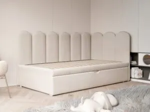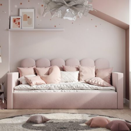 Łóżko SKYE to urocze i praktyczne rozwiązanie, które wnosi do pokoju dziecka przytulność oraz wyjątkowy styl. Jego charakterystycznym elementem jest tapicerowane wezgłowie i boczne oparcie w kształcie płotków, które nadają mu bajkowy, ciepły wygląd. To doskonały wybór dla rodziców, którzy chcą połączyć komfort, bezpieczeństwo i funkcjonalność w jednym meblu.