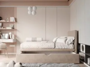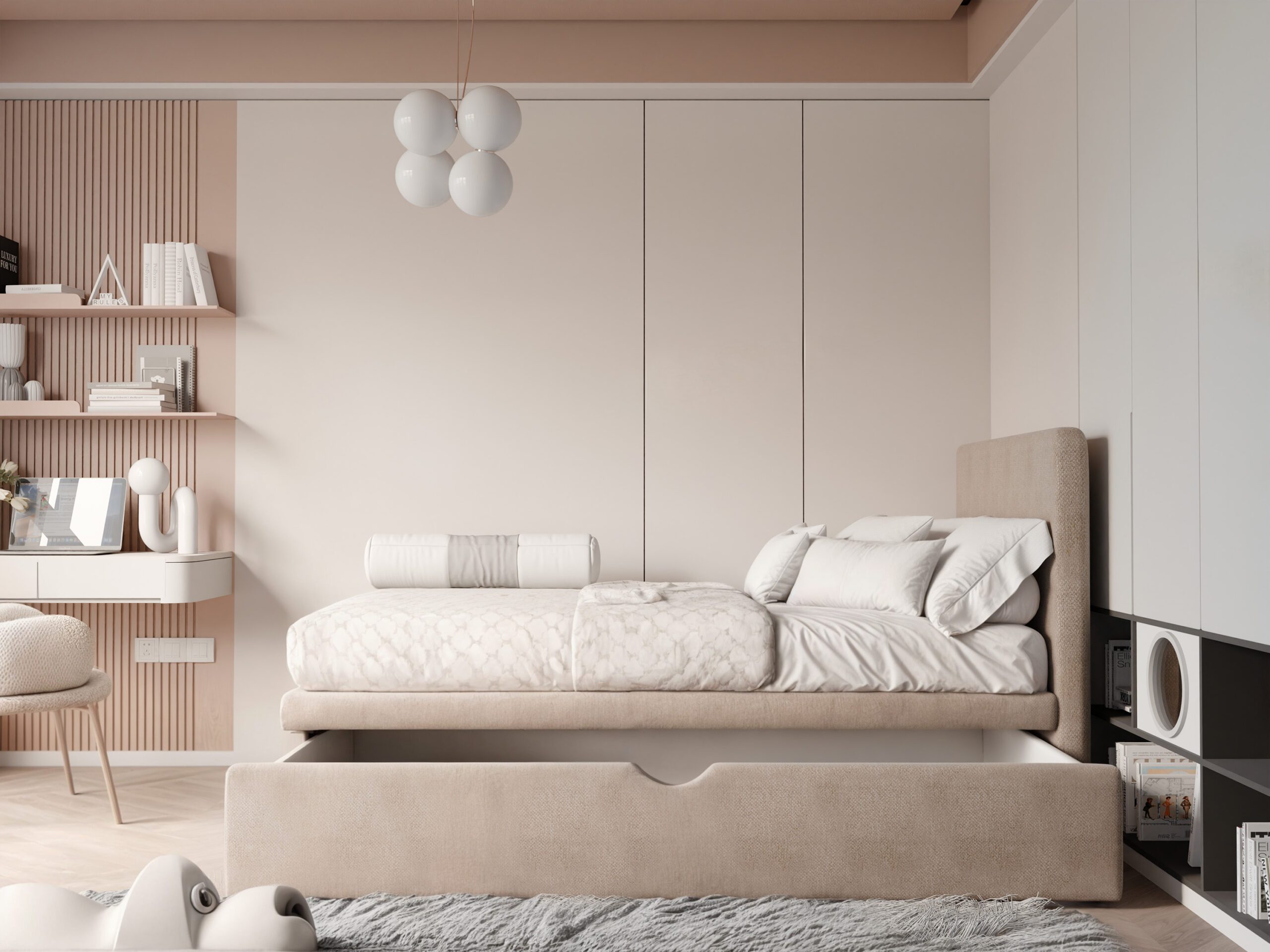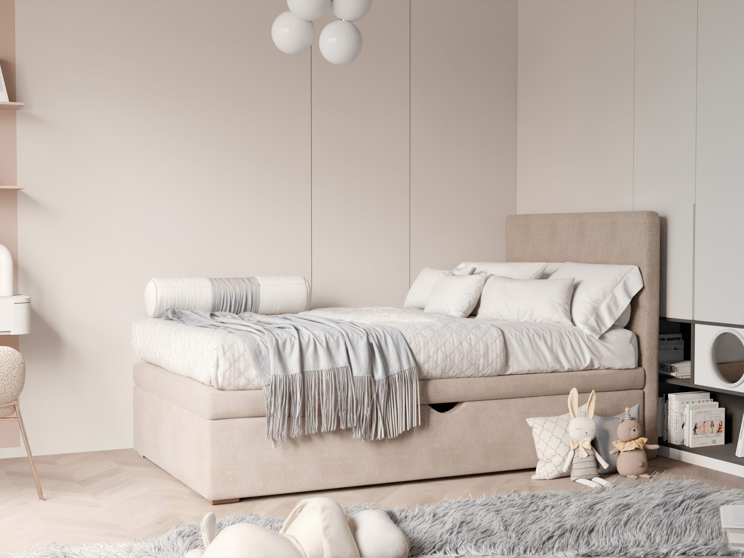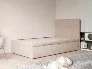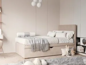 Łóżko wyposażone jest w praktyczną szufladę na pościel, co sprawia, że organizacja przestrzeni staje się łatwiejsza. Wysuwana szuflada pomieści kołdry, poduszki, a także zabawki czy inne drobiazgi, pomagając utrzymać porządek w pokoju
