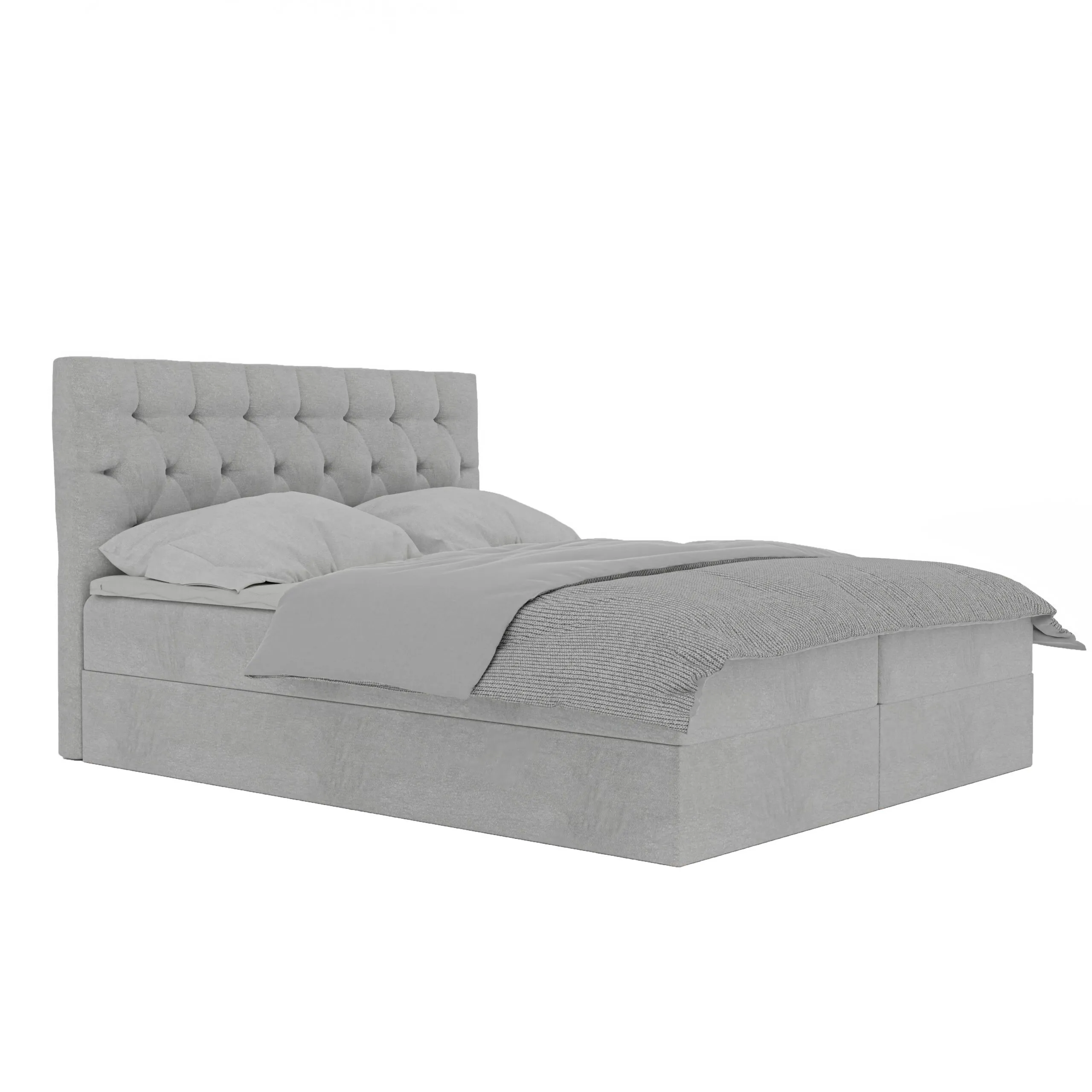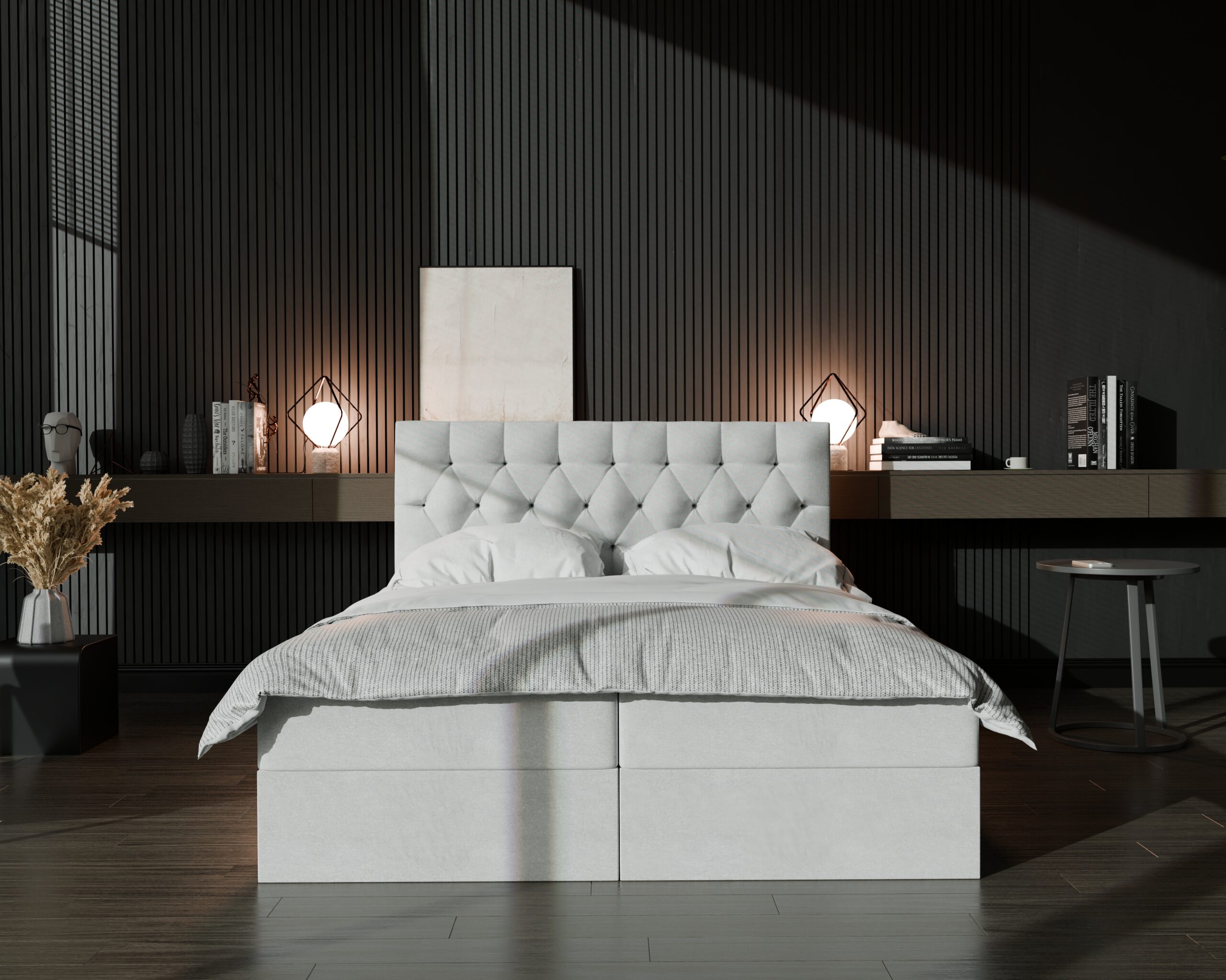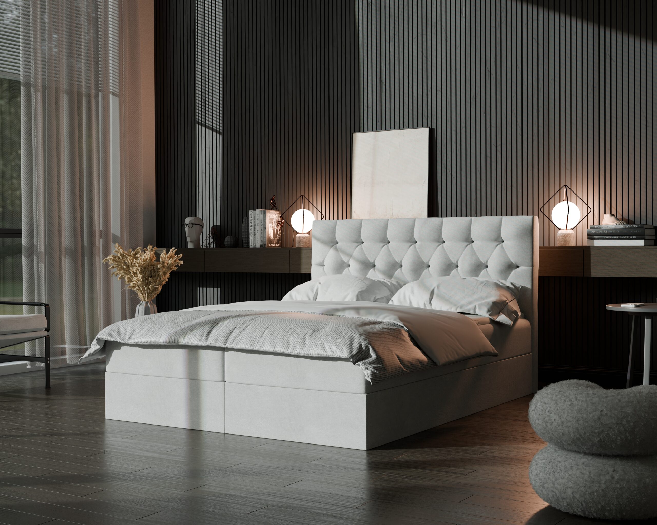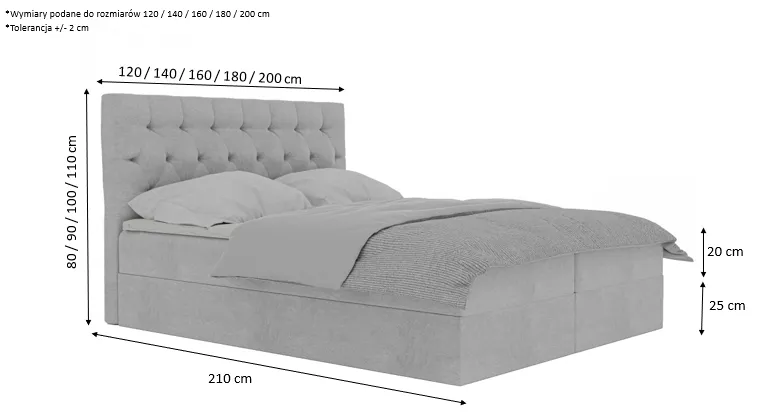 Łóżko kontynentalne BLANCA2 to elegancki, nowoczesny mebel, który łączy styl z funkcjonalnością. Posiada tapicerowane, pikowane wezgłowie, które nadaje mu luksusowego wyglądu.