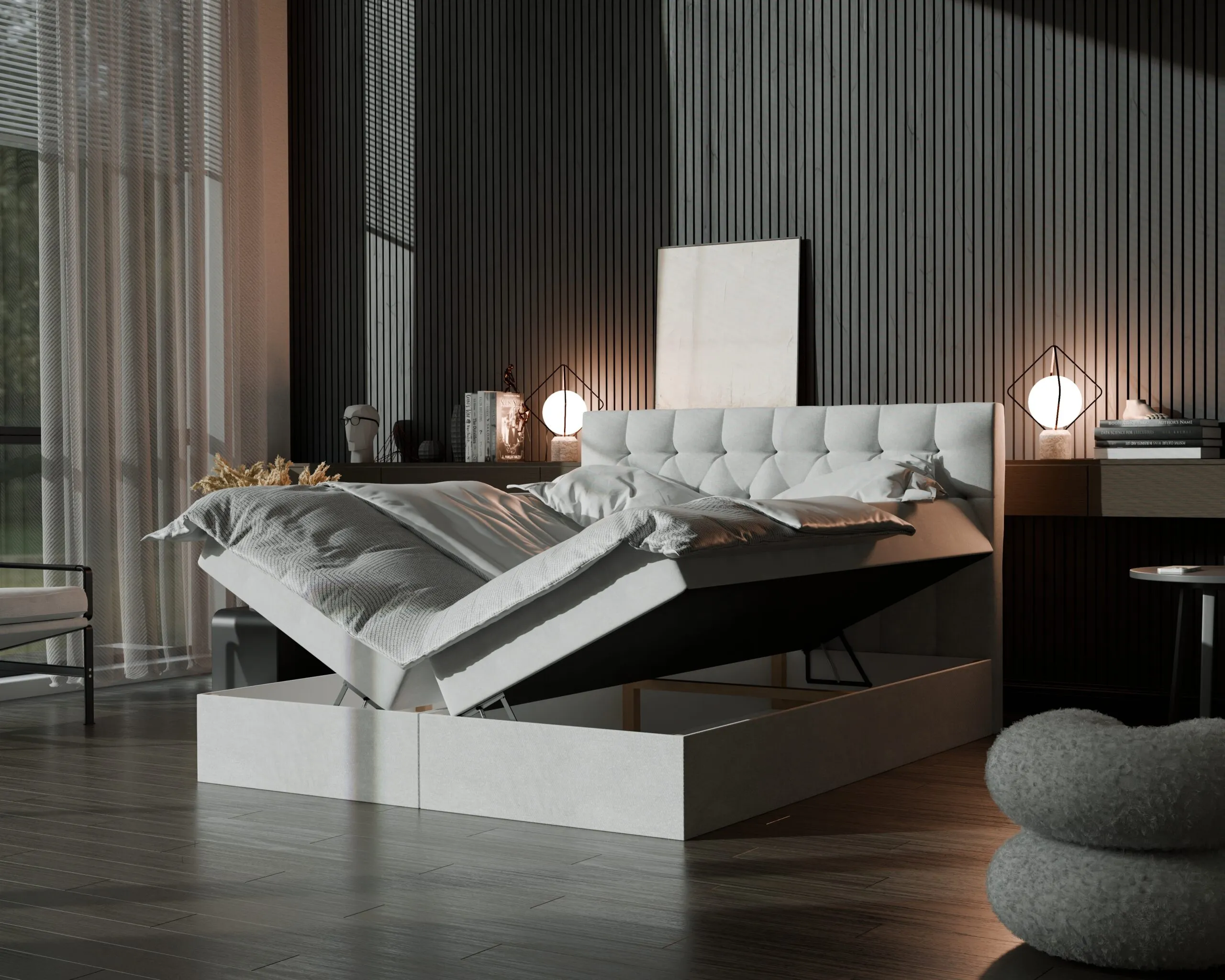 Cechą wyróżniającą te łóżka jest wbudowany system przechowywania pod materacem. Dzięki podnoszonej konstrukcji, dolna część łóżka oferuje dużą przestrzeń na przechowywanie pościeli, koców lub innych przedmiotów, co czyni je praktycznym rozwiązaniem w sypialniach o ograniczonej powierzchni.