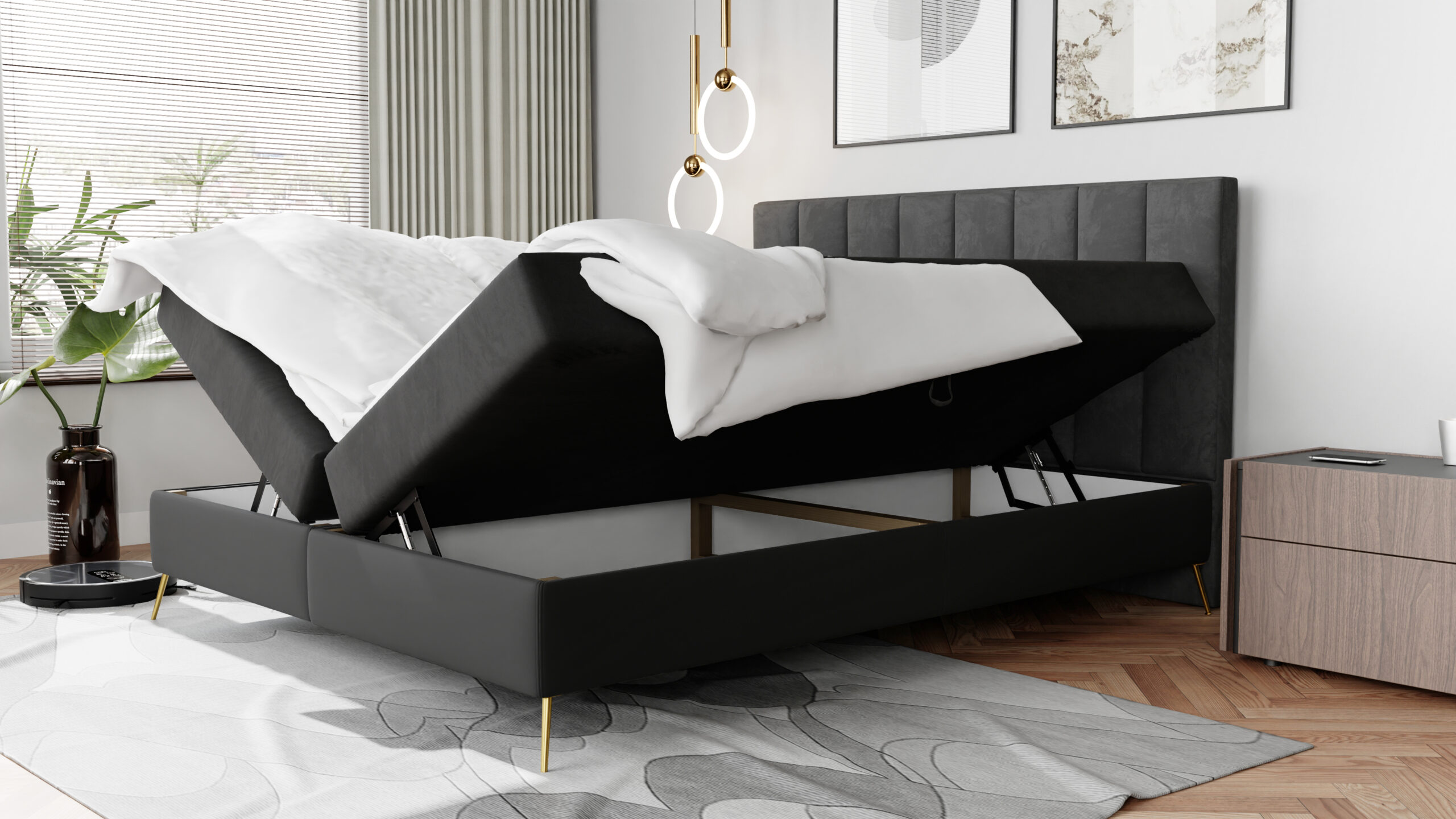 Co więcej, łóżko kontynentalne BOX 1 posiada wbudowane dwa osobne pojemniki na pościel, otwierające się do boku. To inteligentne rozwiązanie pozwala na utrzymanie porządku i maksymalne wykorzystanie przestrzeni.