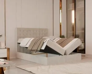 Cechą wyróżniającą te łóżka jest wbudowany system przechowywania pod materacem. Dzięki podnoszonej konstrukcji, dolna część łóżka oferuje dużą przestrzeń na przechowywanie pościeli, koców lub innych przedmiotów, co czyni je praktycznym rozwiązaniem w sypialniach o ograniczonej powierzchni.
