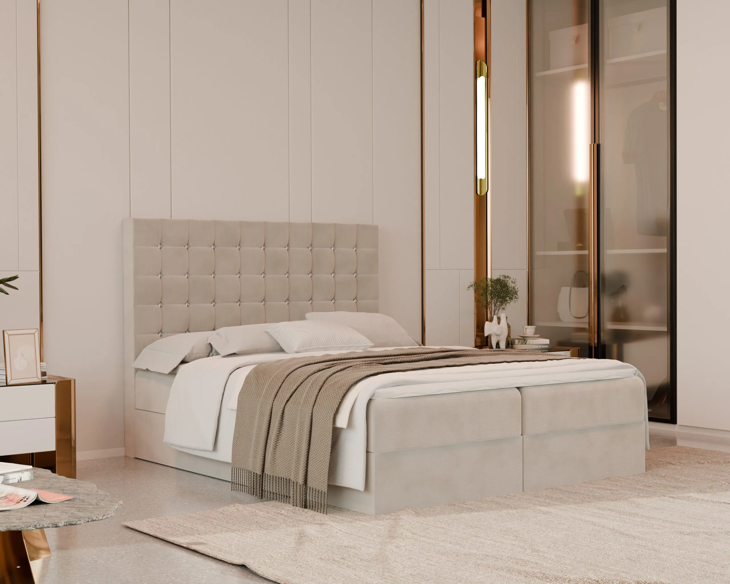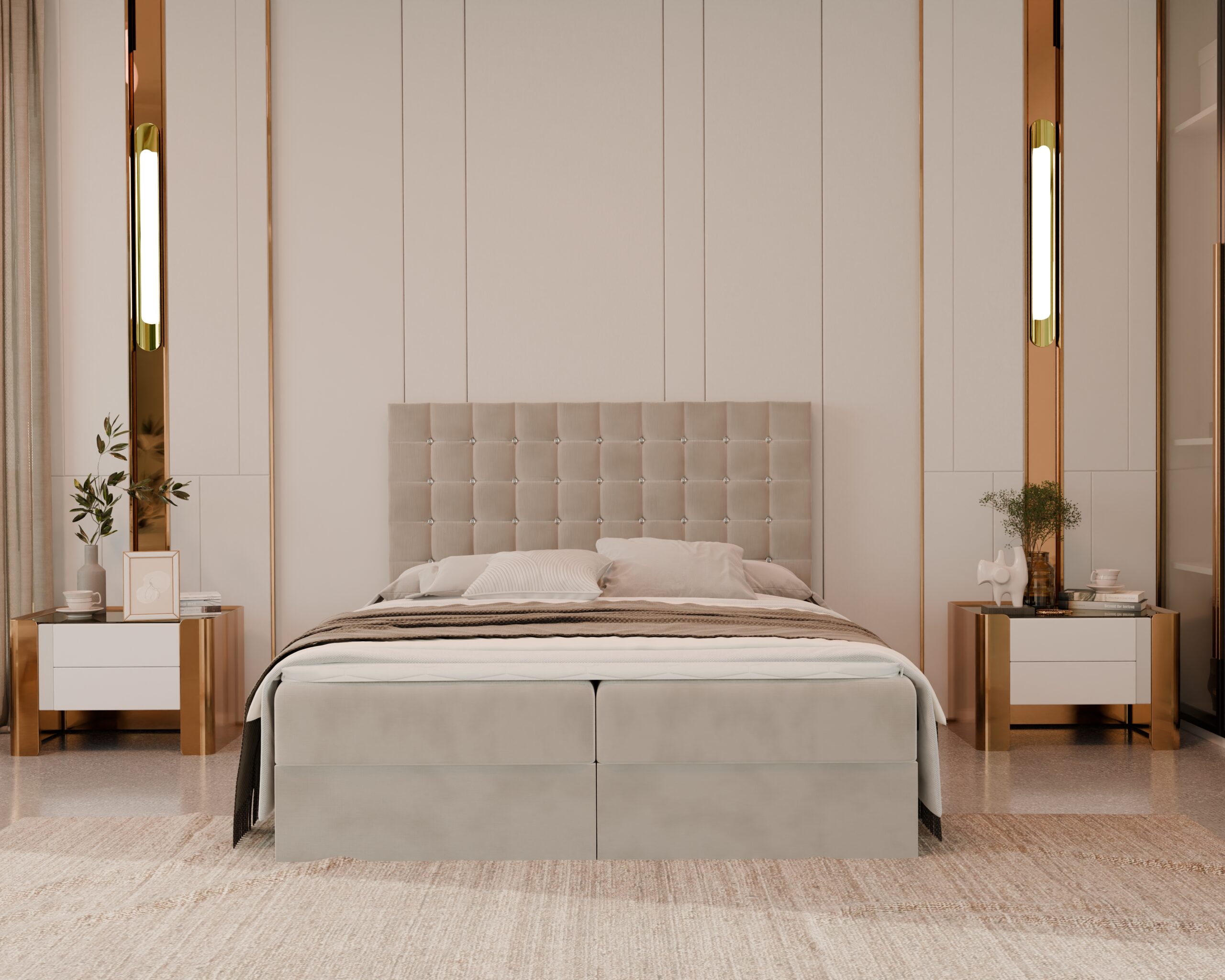 Zagłówek jest tapicerowany z pikowaniem w kwadratowy wzór, co nadaje mu elegancji i wyrafinowania.