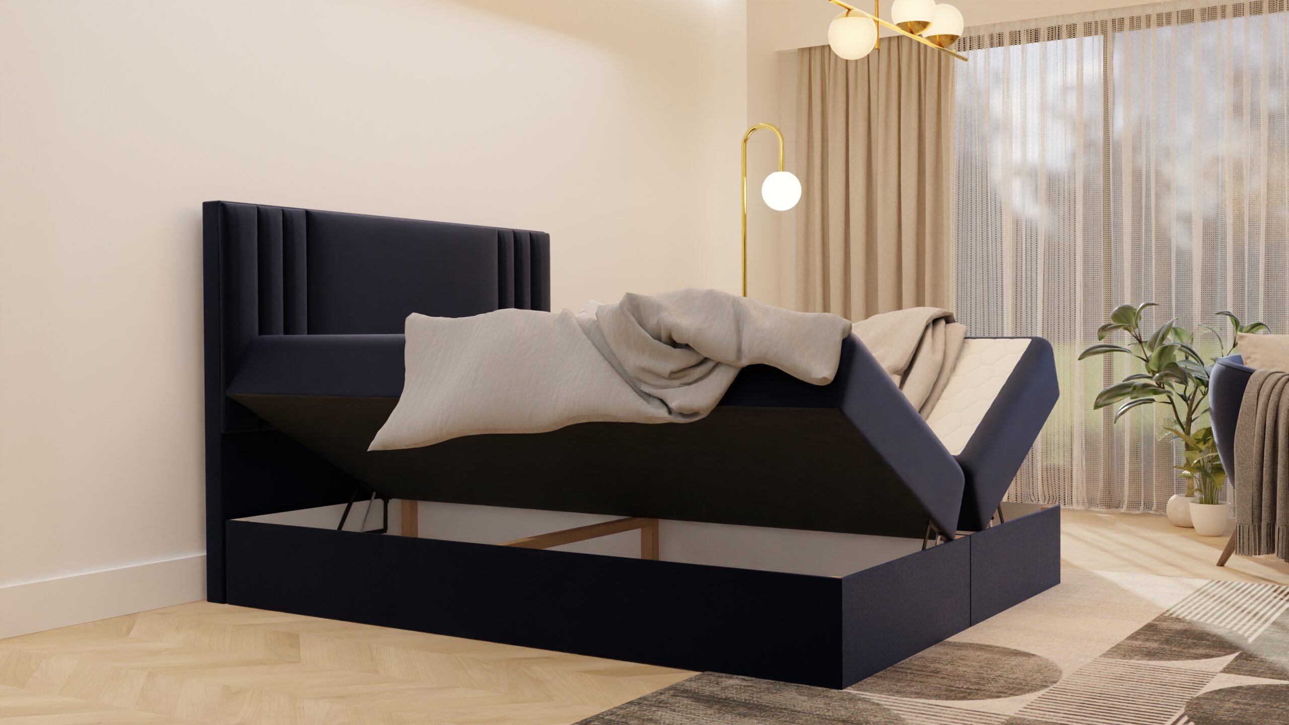 Łóżko SISI 2 posiada wbudowany materac kieszeniowy 7-strefowy, który zapewnia doskonałe podparcie dla kręgosłupa i komfortowy sen. Dodatkowo, wyposażone jest w dwa osobne pojemniki na pościel, otwierające się na boki, co stanowi wygodne i praktyczne rozwiązanie do przechowywania dodatkowej pościeli czy poduszek.