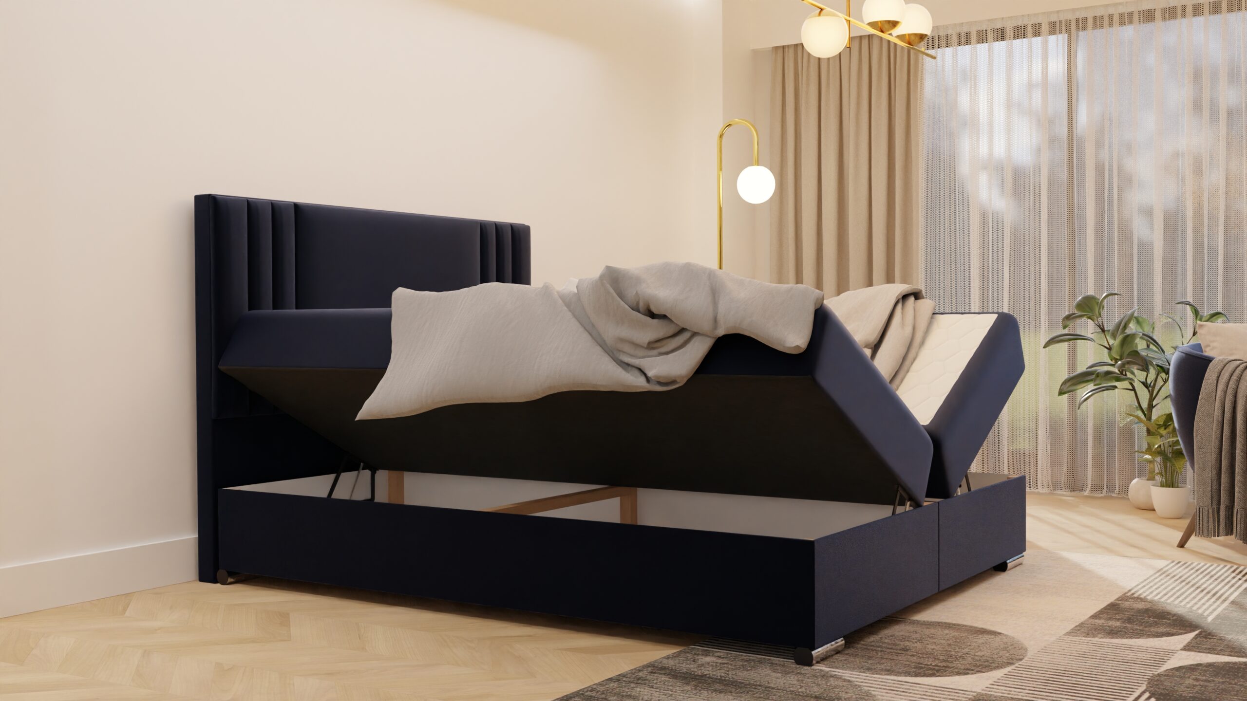 Łóżko SISI posiada wbudowany materac kieszeniowy 7-strefowy, który zapewnia wysoki komfort snu, dostosowując się do kształtu ciała. Dodatkowo, wyposażone jest w dwa osobne pojemniki na pościel, otwierające się na boki, co stanowi wygodne i praktyczne rozwiązanie do przechowywania dodatkowej pościeli czy poduszek.