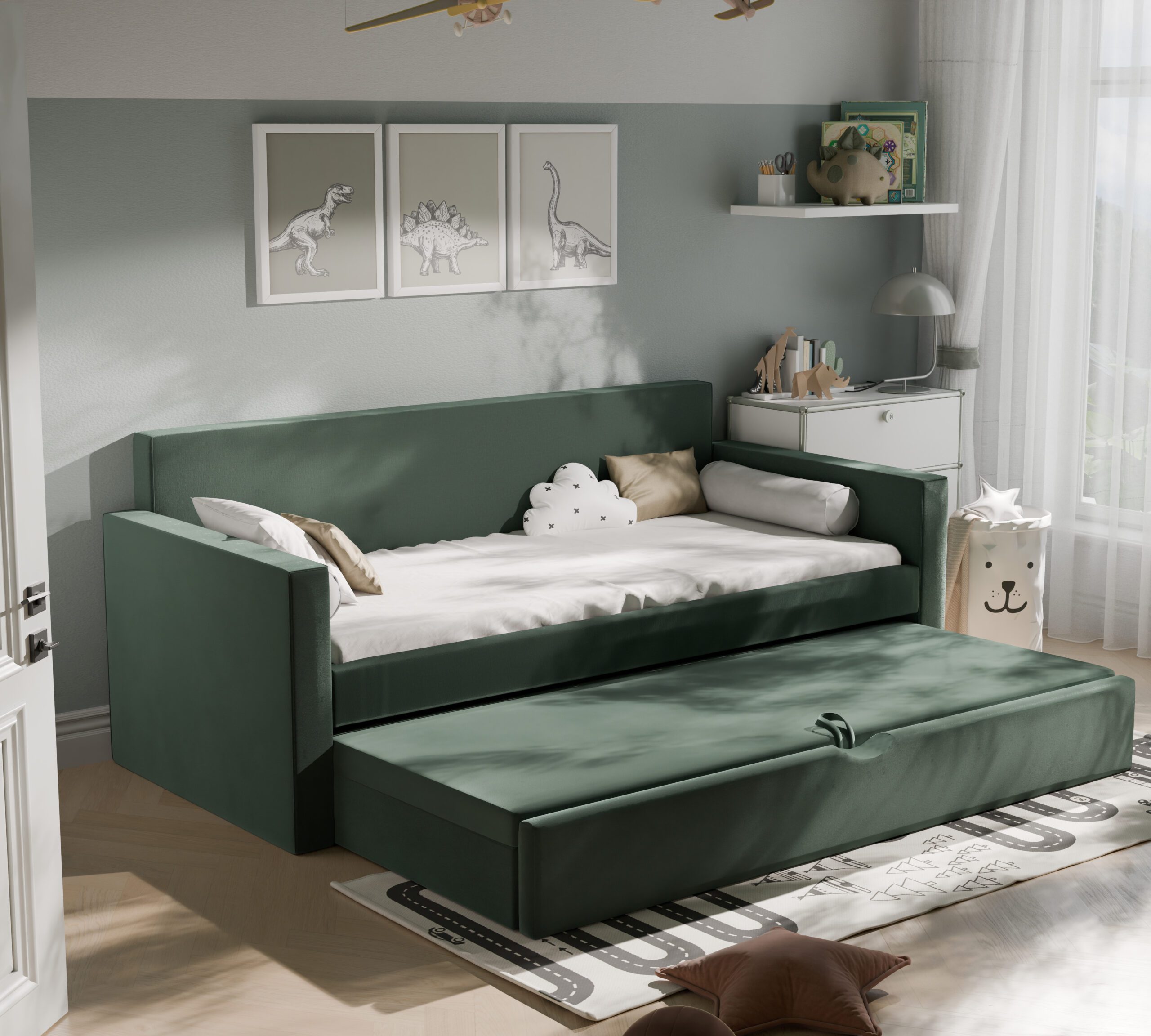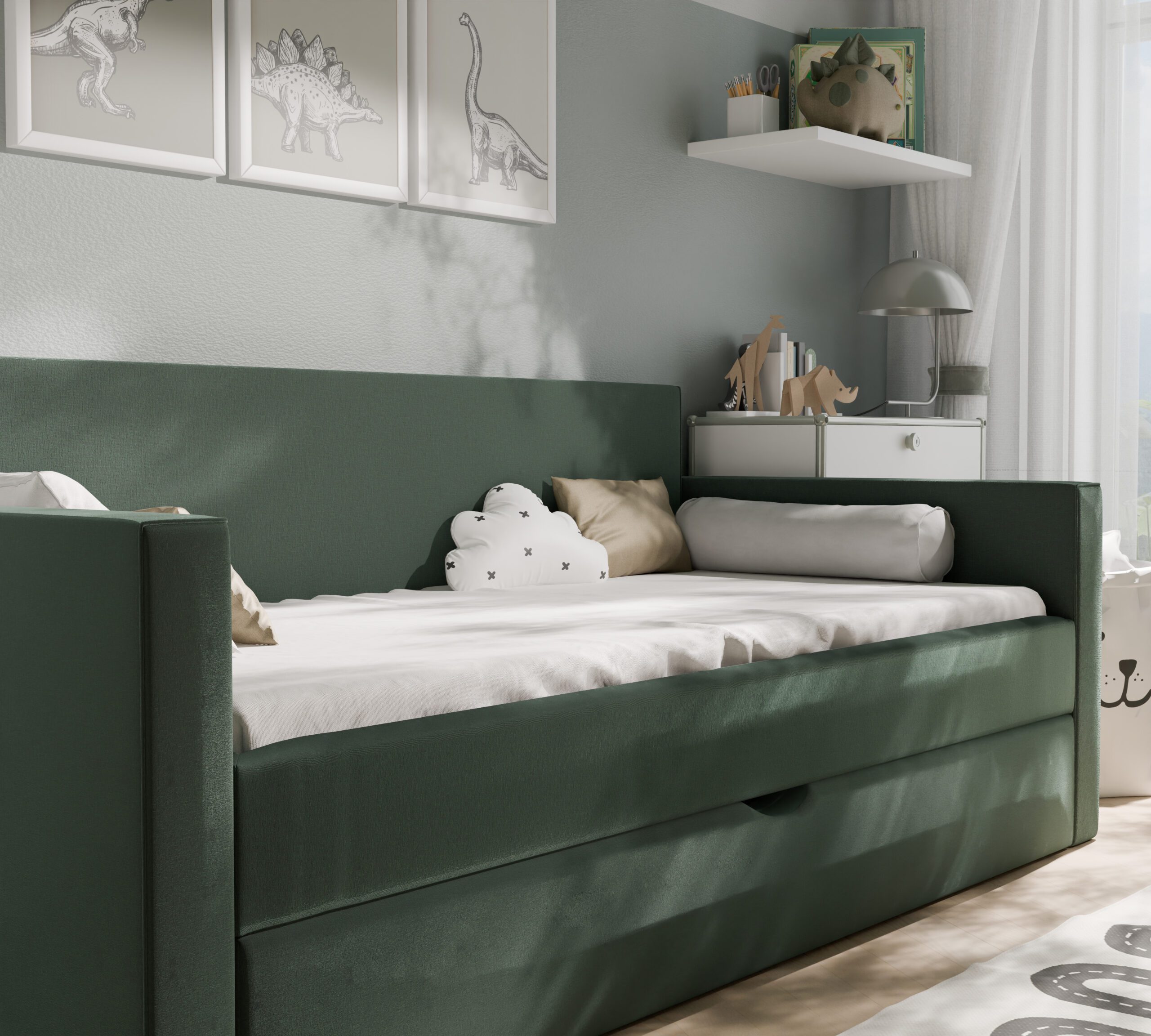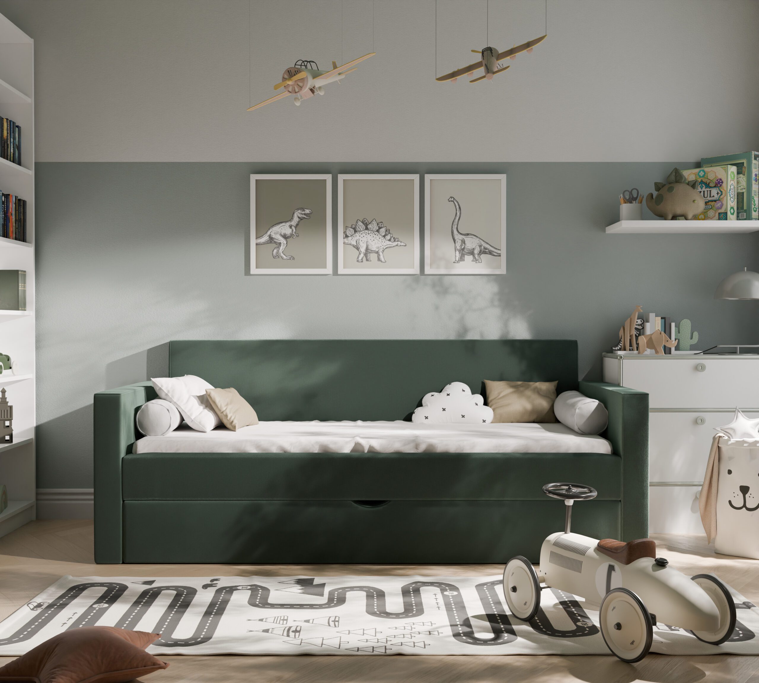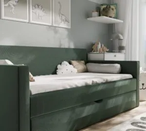 Zielone łóżko wykonane jest w tkaninie ROYAL VELVET 29848