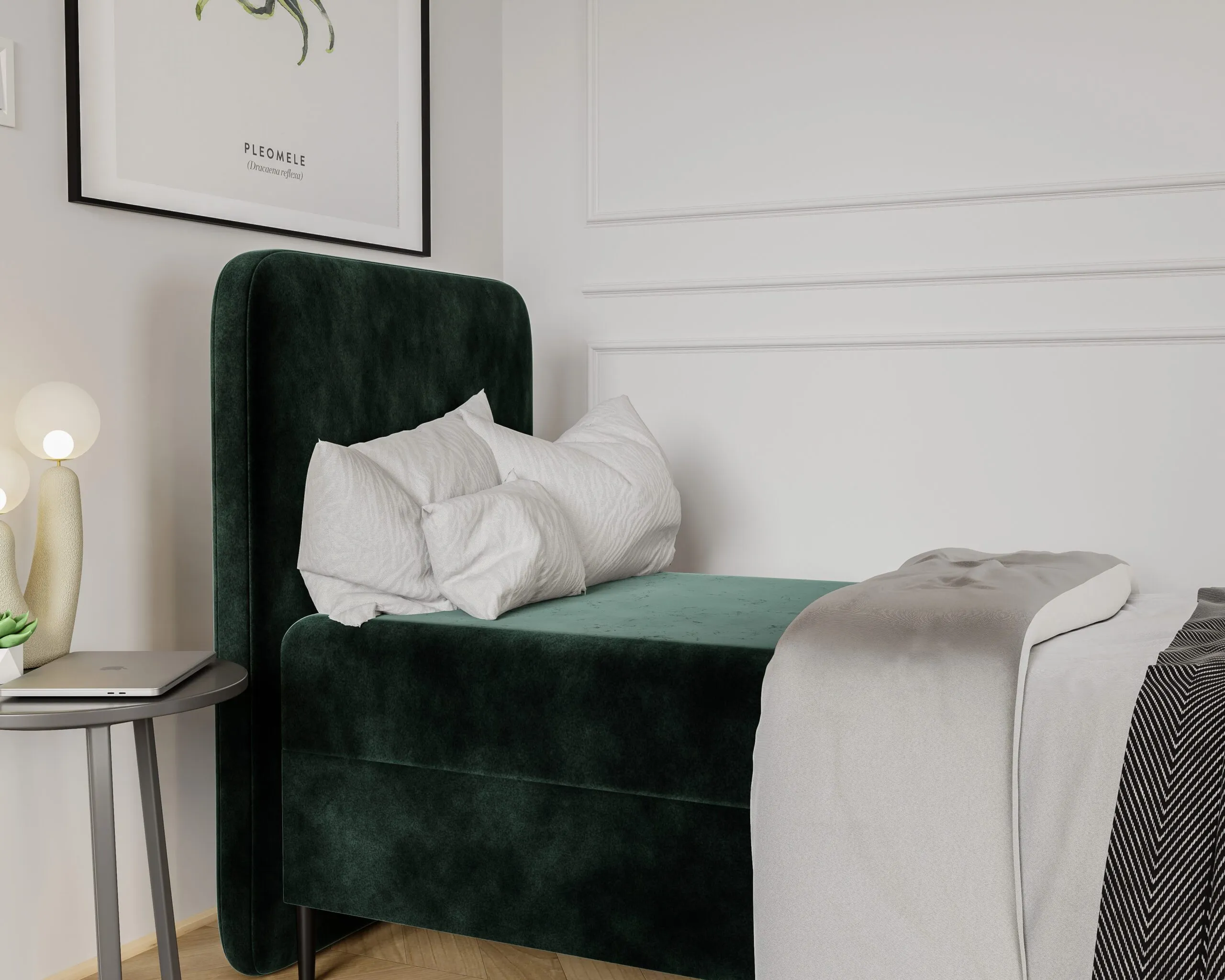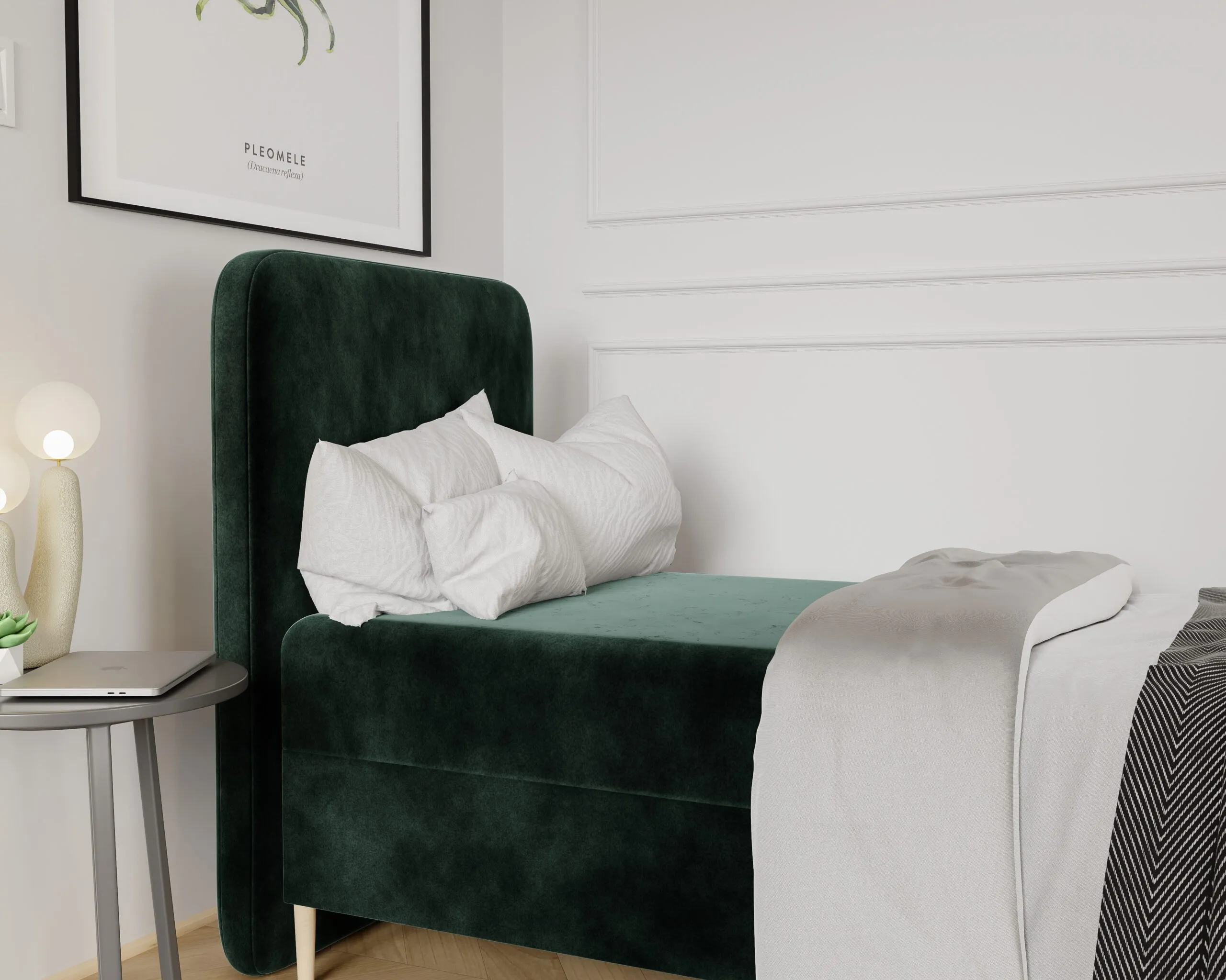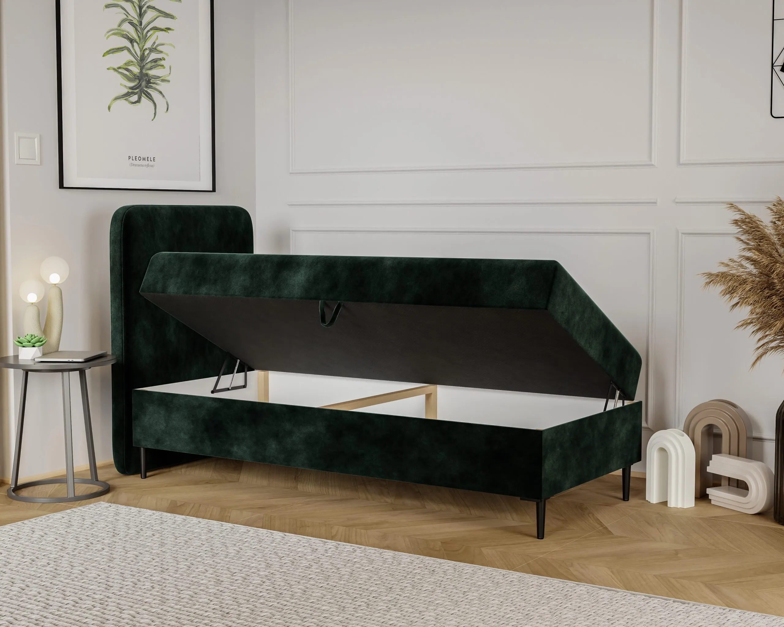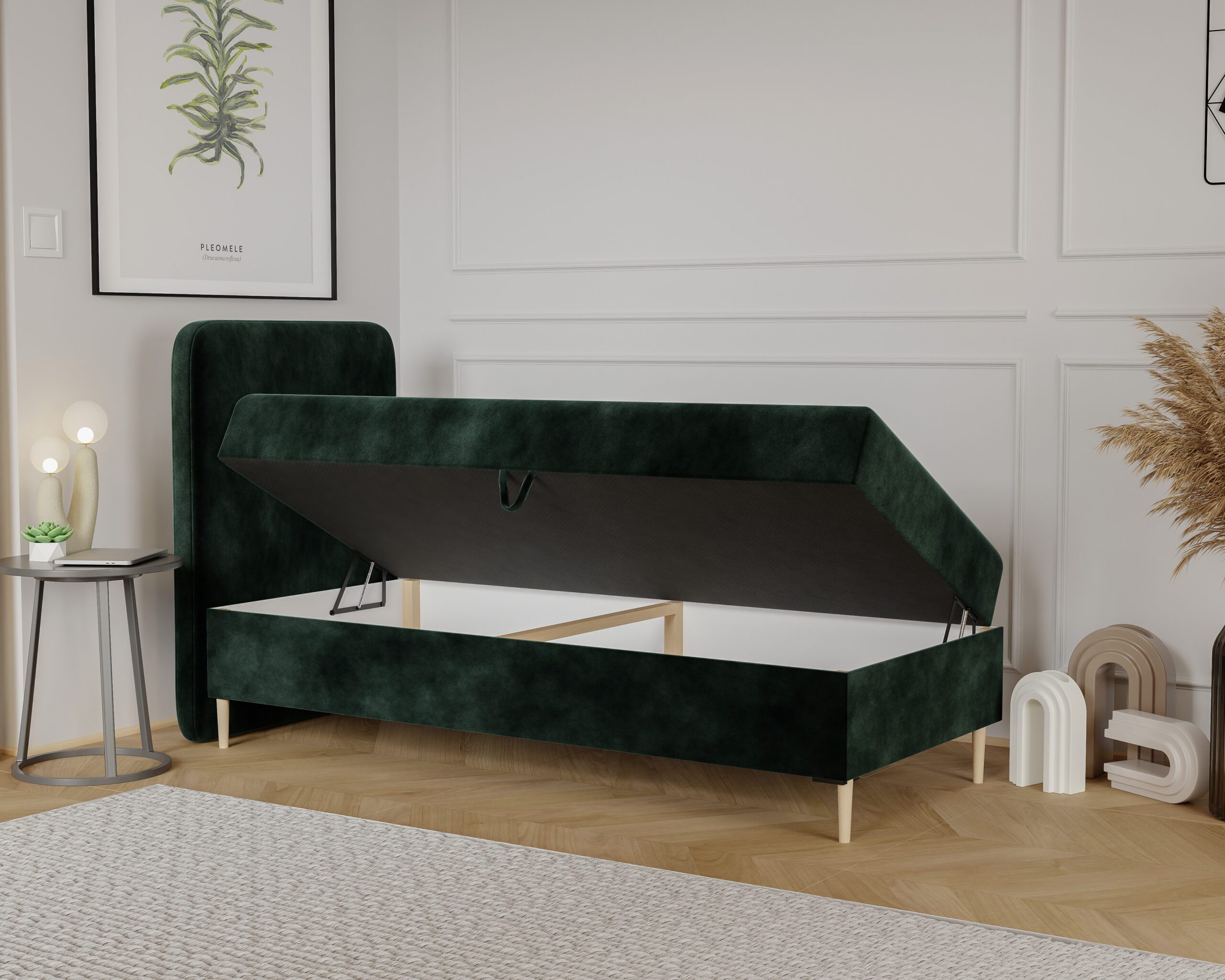 Łóżko wyposażone jest w podnoszony pojemnik na pościel , co sprawia, że organizacja przestrzeni staje się łatwiejsza.