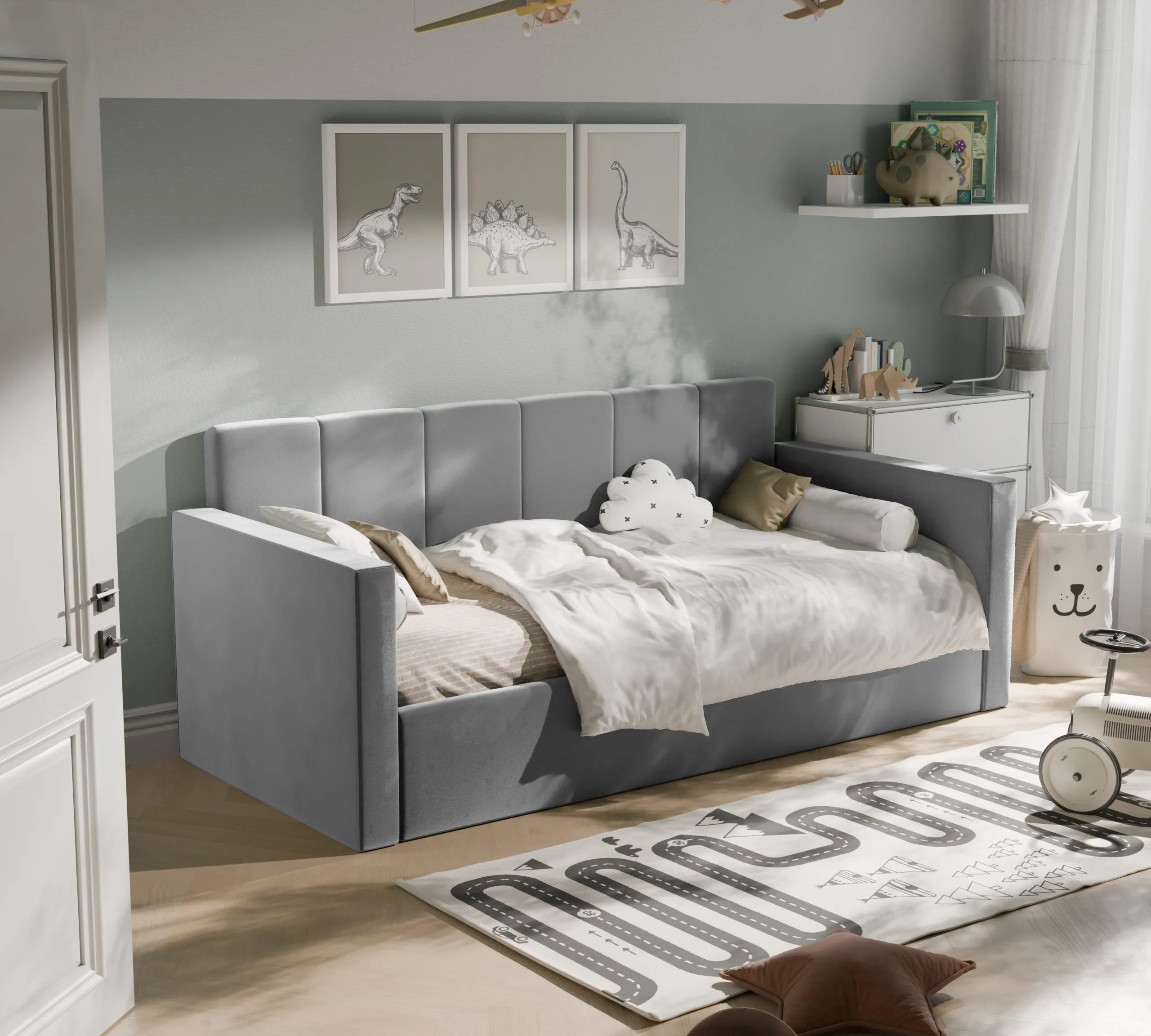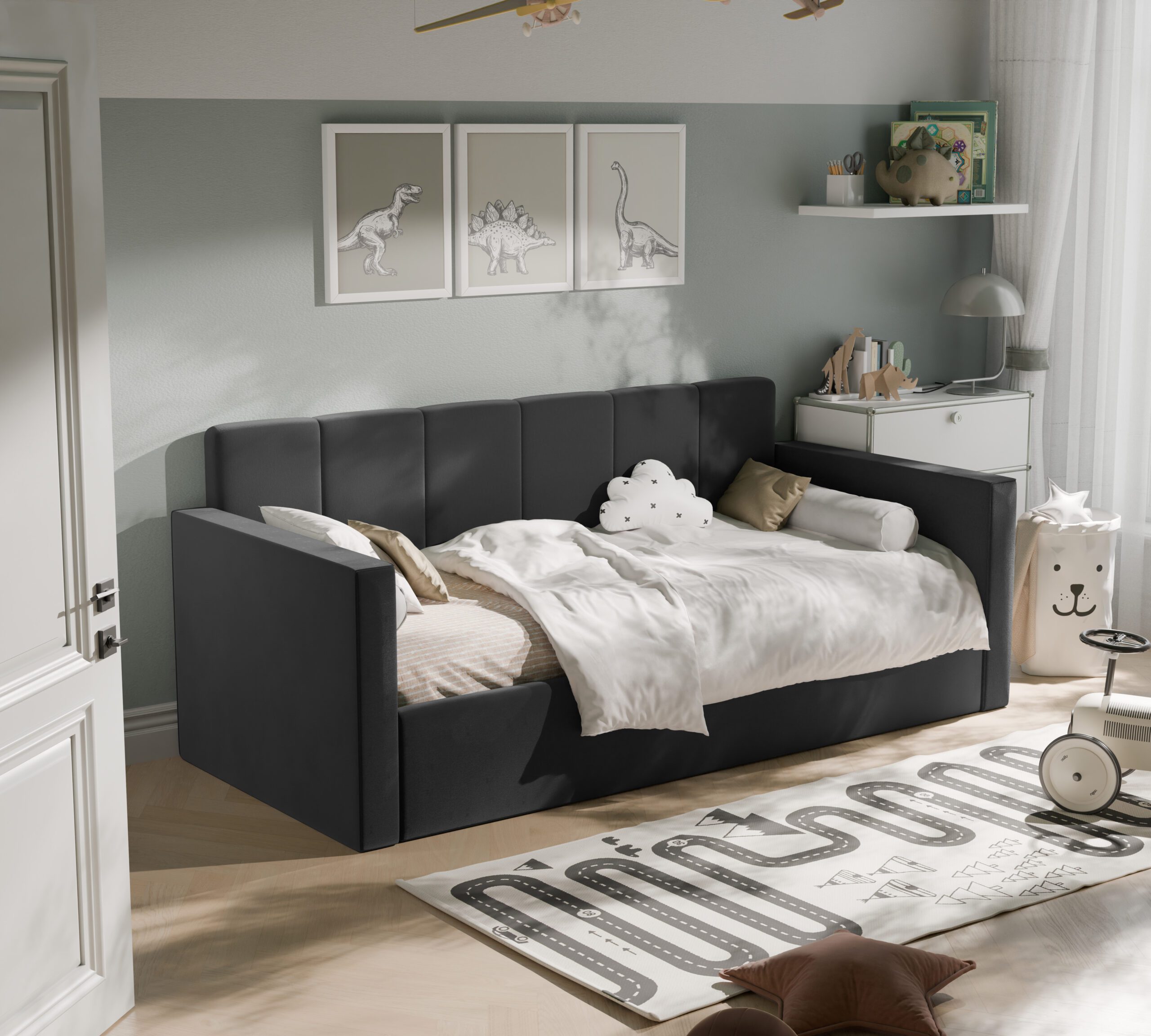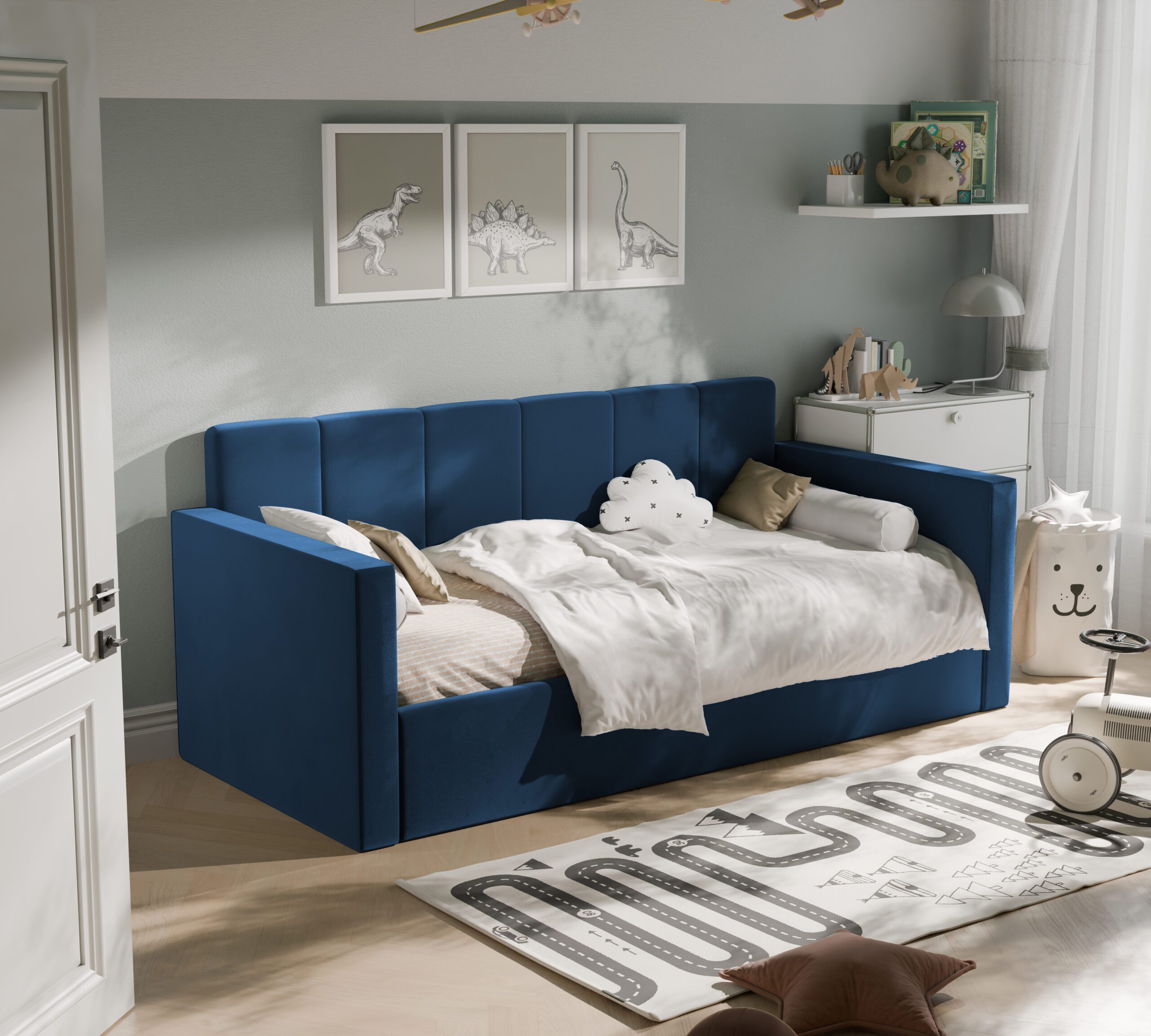Nowoczesne i praktyczne rozwiązanie do pokoju najmłodszych. Zaprojektowane z myślą o wygodzie, bezpieczeństwie i estetyce, świetnie sprawdzi się zarówno jako miejsce do spania, jak i dzienna sofa.