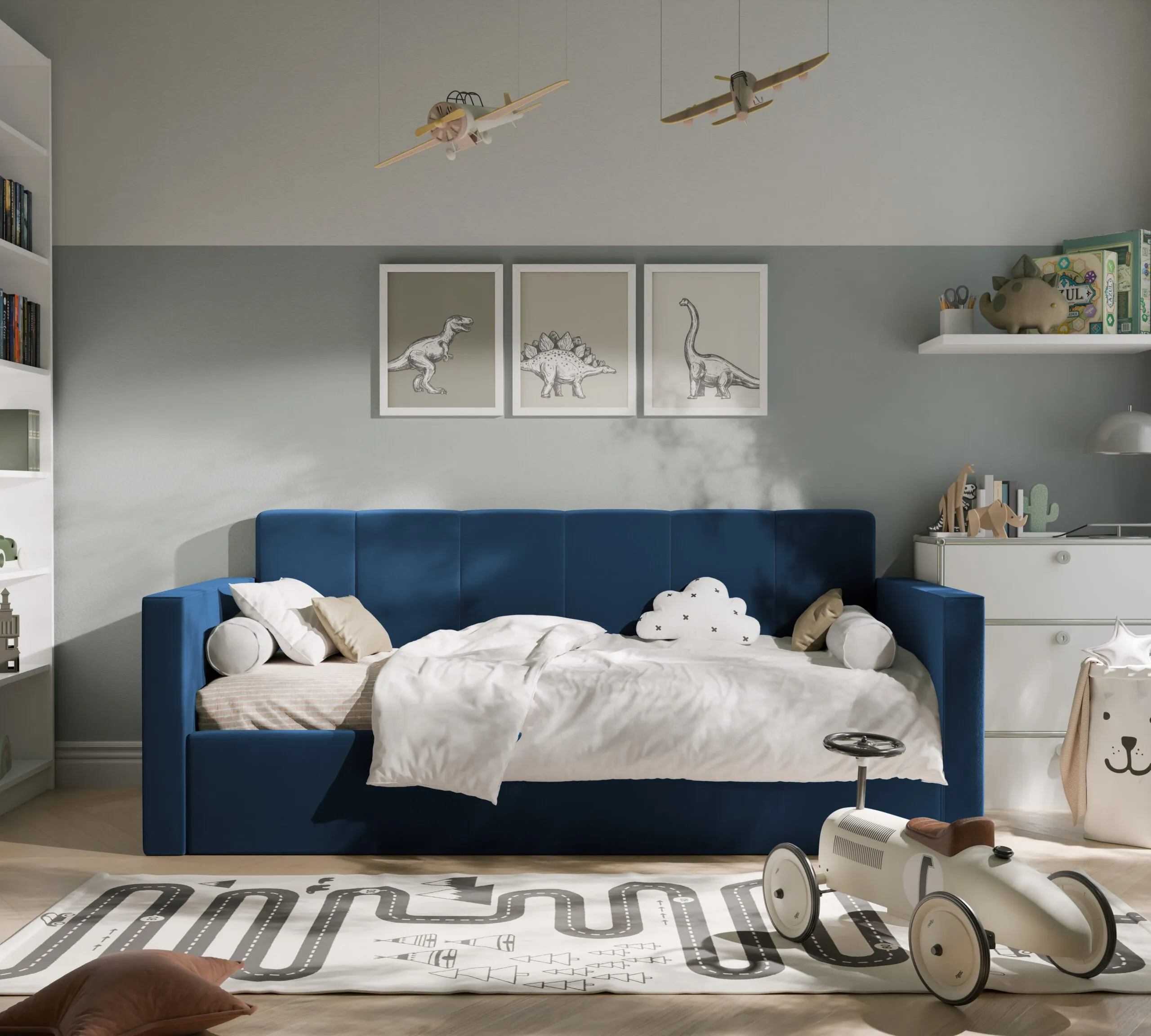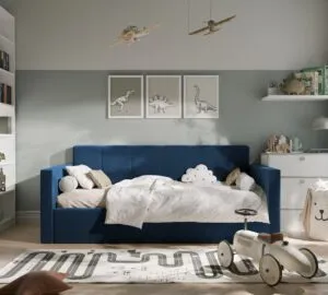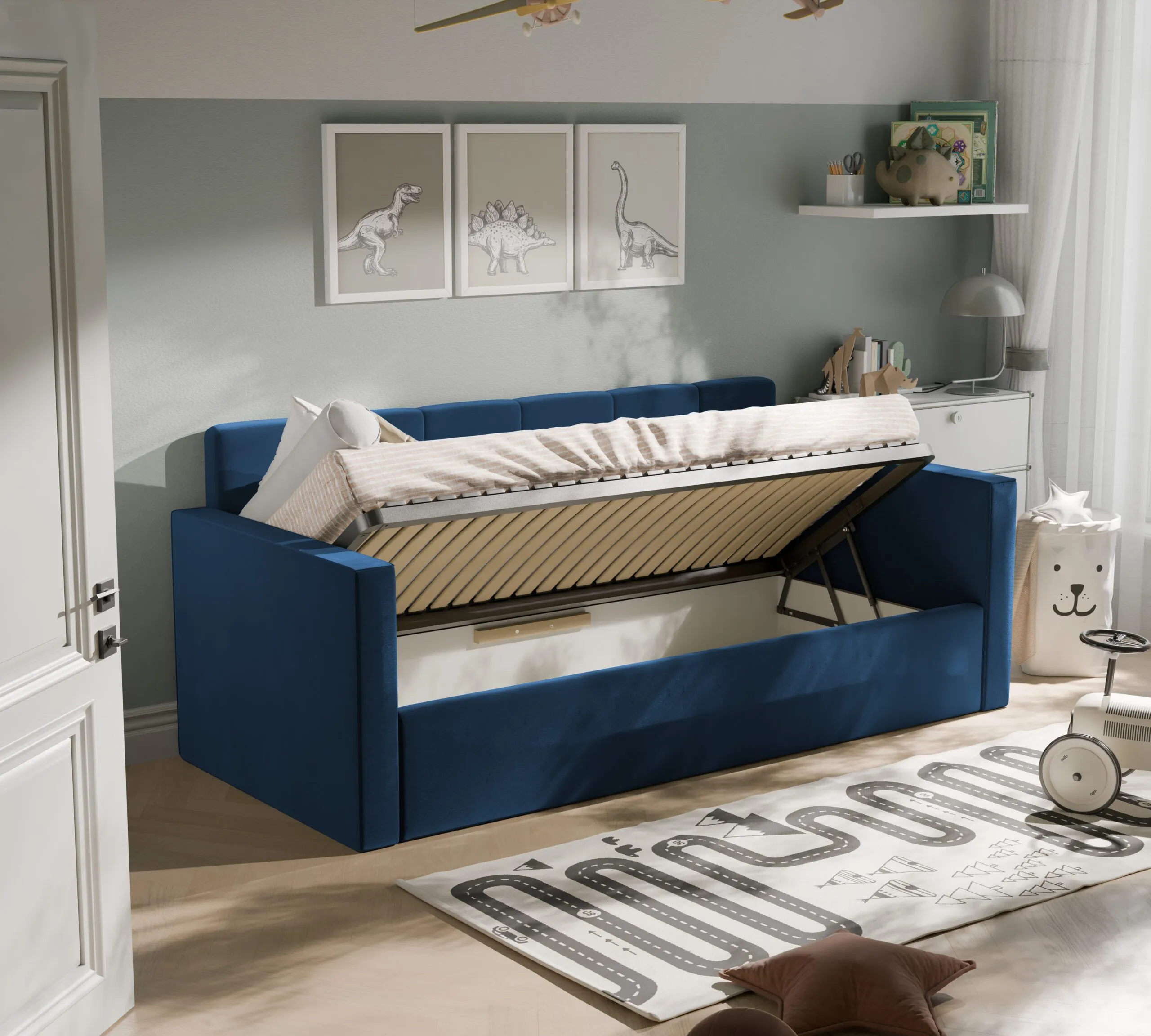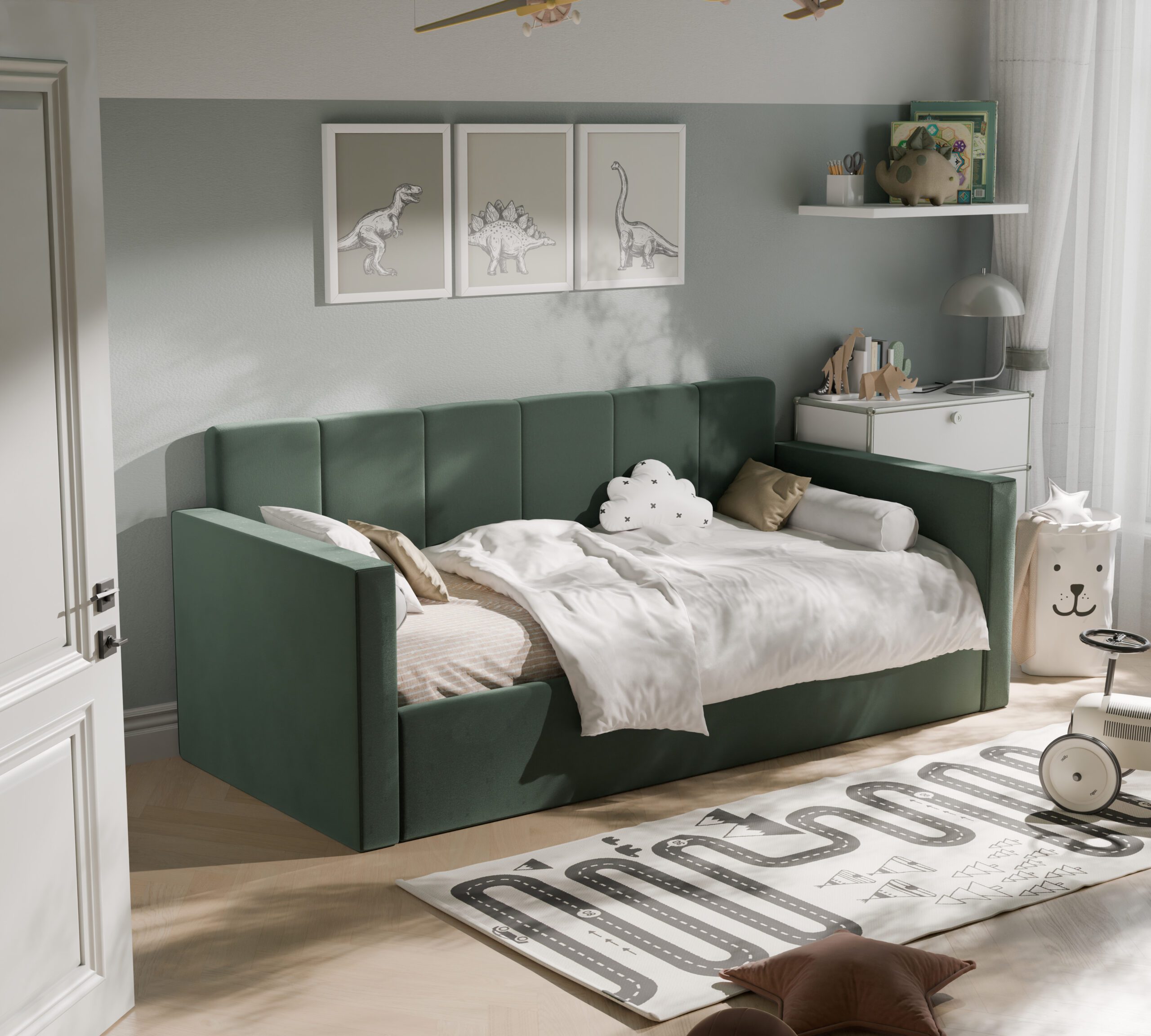 Nowoczesne i praktyczne rozwiązanie do pokoju najmłodszych. Zaprojektowane z myślą o wygodzie, bezpieczeństwie i estetyce, świetnie sprawdzi się zarówno jako miejsce do spania, jak i dzienna sofa.