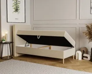Łóżko wyposażone jest w podnoszony pojemnik na pościel , co sprawia, że organizacja przestrzeni staje się łatwiejsza.