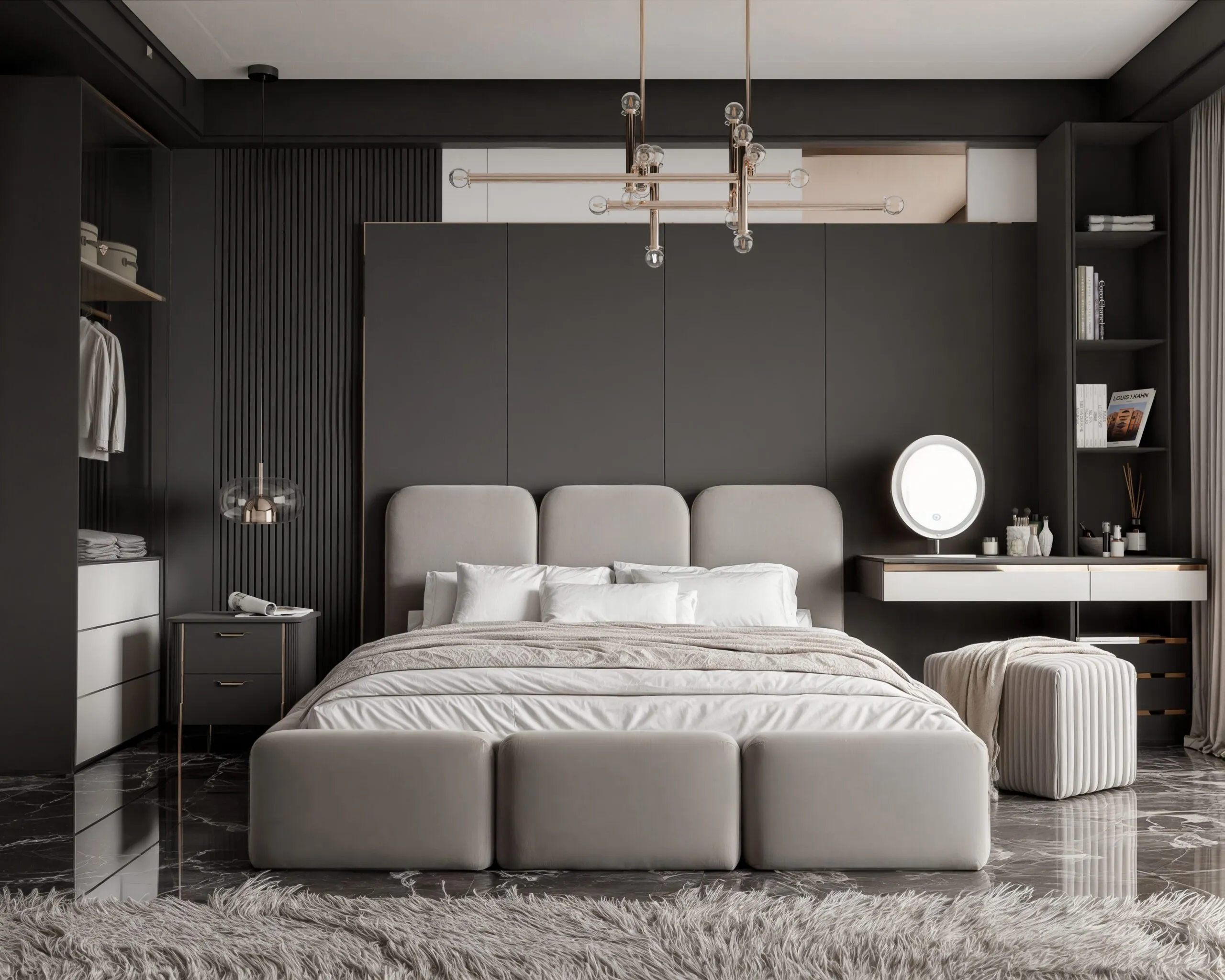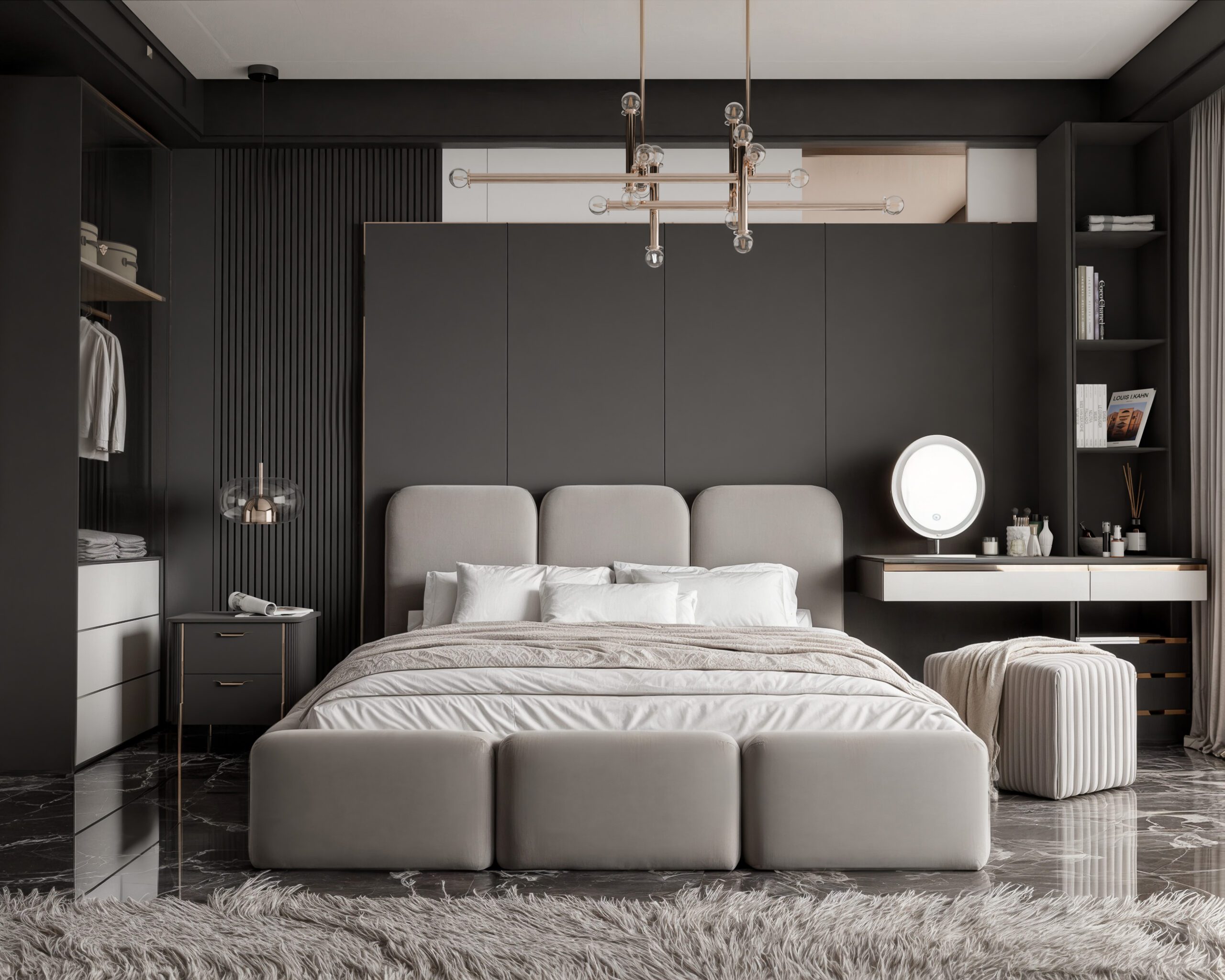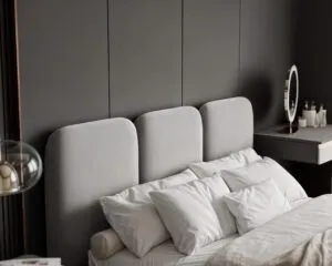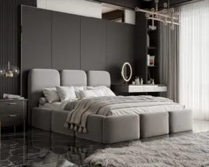 ·   wezgłowie z paneli: Wysokie, tapicerowane wezgłowie składa się z eleganckich paneli, które dodają wnętrzu przytulności i stylu.​