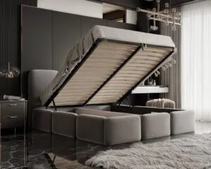·   funkcjonalny pojemnik na pościel: Łóżko wyposażone jest w przestronny schowek na pościel, koce czy poduszki. Dostęp do pojemnika ułatwia mechanizm podnoszenia materaca oparty na siłownikach gazowych
