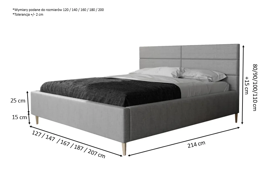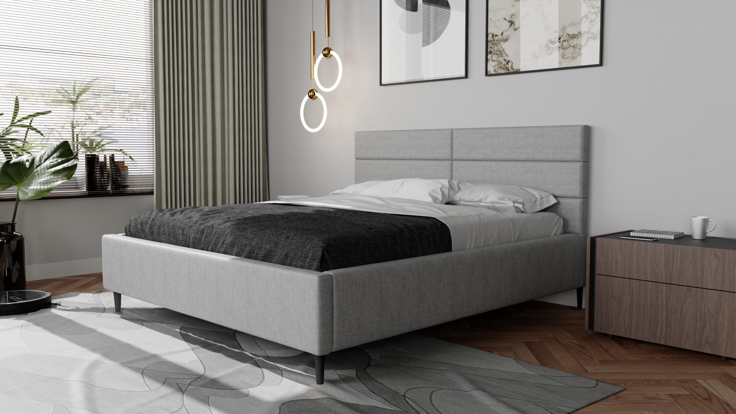 Łóżko sypialniane tapicerowane BASIC SLIM z czterema prostokątami na zagłówku to prosty, ale elegancki mebel, który dodaje stylu, struktury i wzoru do Twojej sypialni.