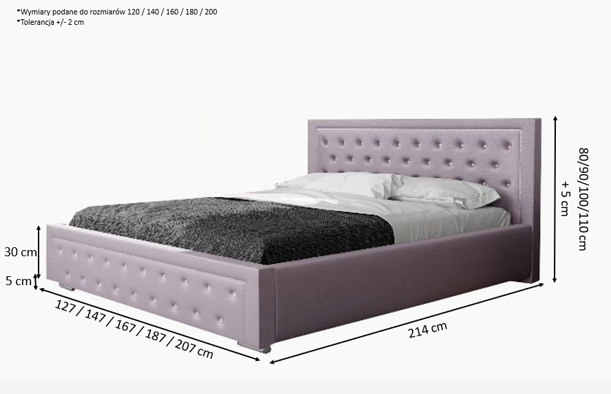 Elementem ozdobnym są diamenty umieszczone na wezgłowiu i panelu przednim, dodające blasku i luksusowego charakteru.
