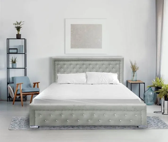 Charakterystycznym akcentem ozdobnym są efektowne, połyskujące diamenty umieszczone zarówno na wysokim, miękko tapicerowanym wezgłowiu, jak i na przednim panelu łóżka. Ich subtelny blask przyciąga wzrok, wprowadzając nutę glamour i luksusu.