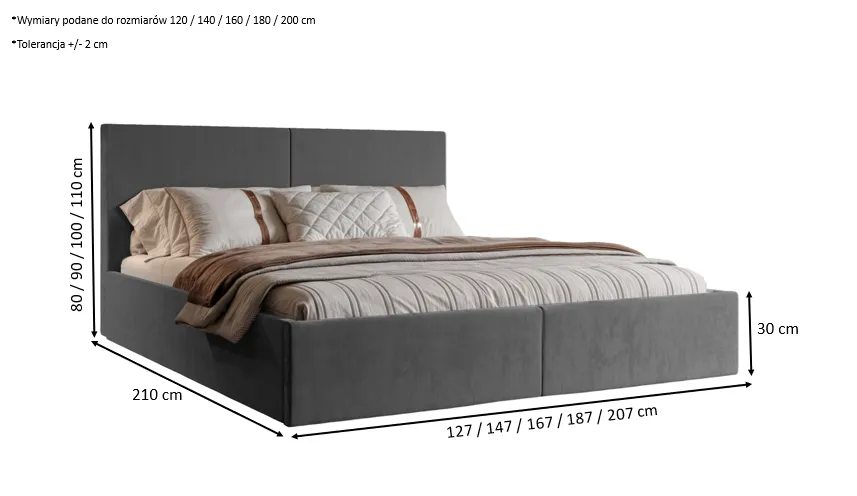 Miękkie tapicerowanie nie tylko wpływa na komfort użytkowania, ale również nadaje całości przytulny, domowy klimat. Solidna konstrukcja zapewnia stabilność, a możliwość wyboru koloru tkaniny pozwala dopasować łóżko do indywidualnych preferencji i stylu sypialni.