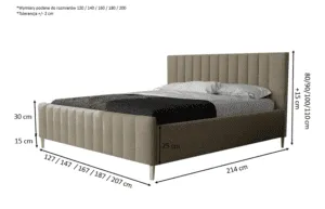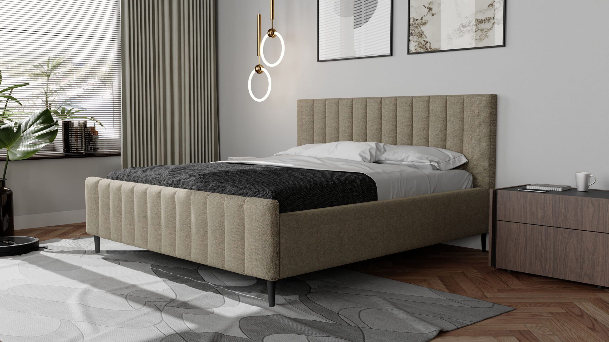 Tapicerowane łóżko sypialniane SIMON SLIM z szerszymi pierwszymi pasami oraz takim samym, wyższym panelem przednim, zapewniające elegancki i nowoczesny wygląd.