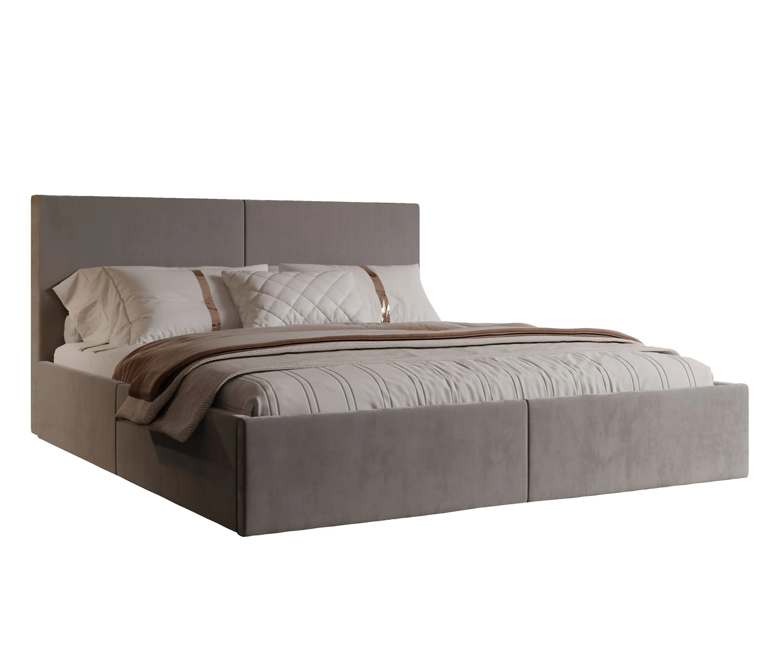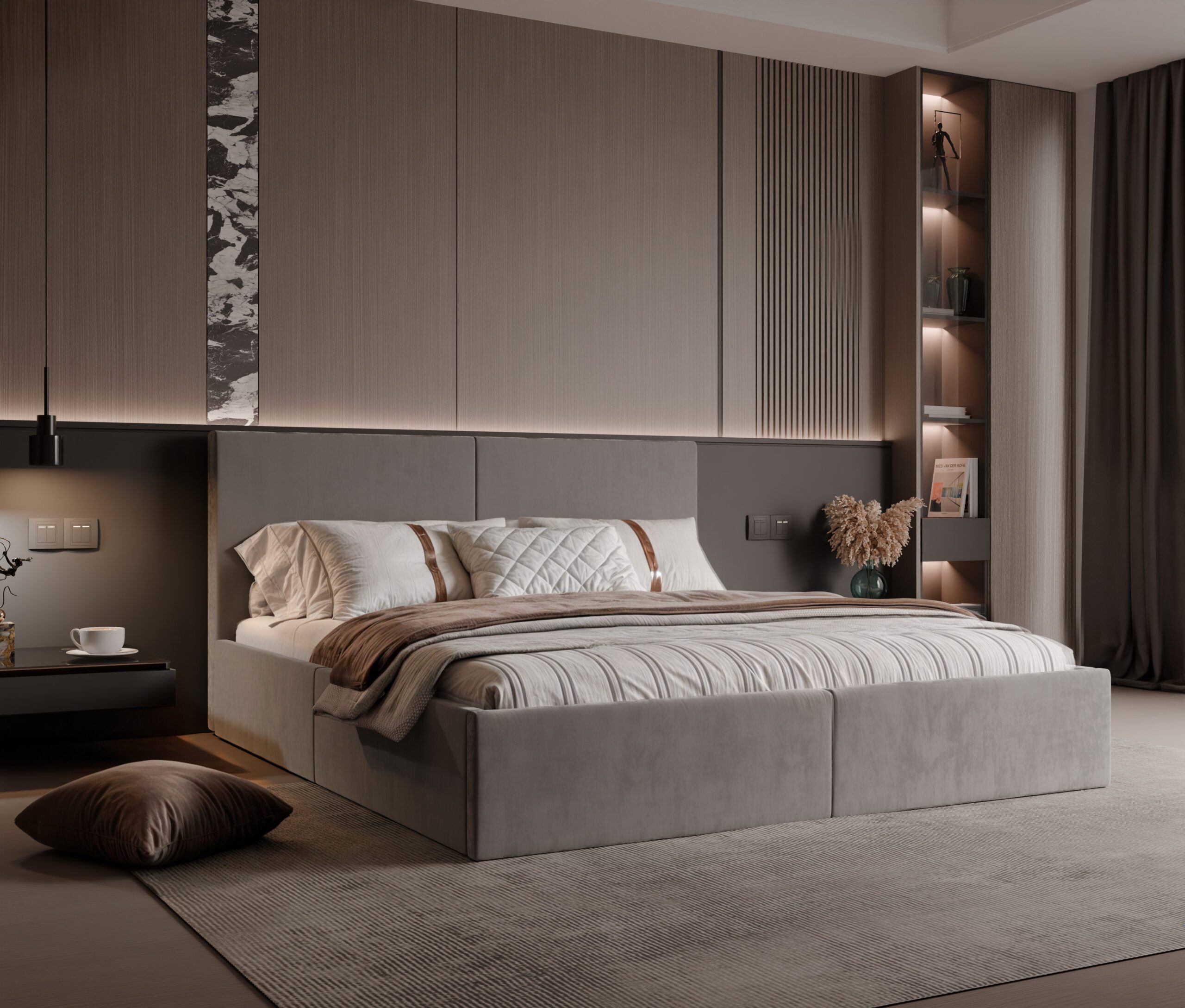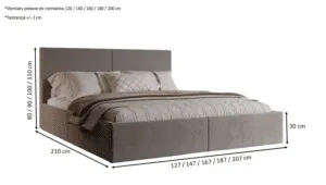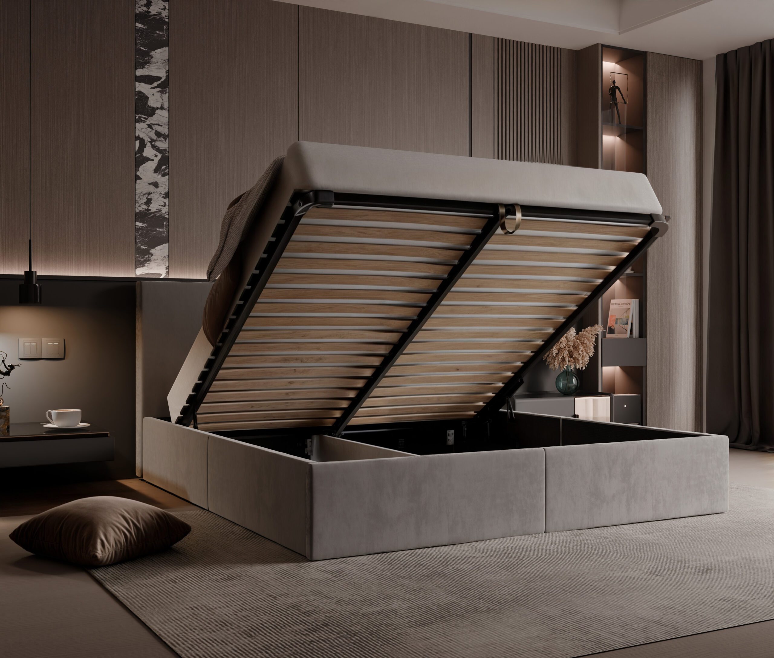 Solidna rama łóżka, elegancka tapicerka, praktyczny pojemnik na pościel – Dzięki wygodnemu mechanizmowi podnoszenia, dostęp do pojemnika jest szybki i łatwy, co umożliwia oszczędne zarządzanie przestrzenią.