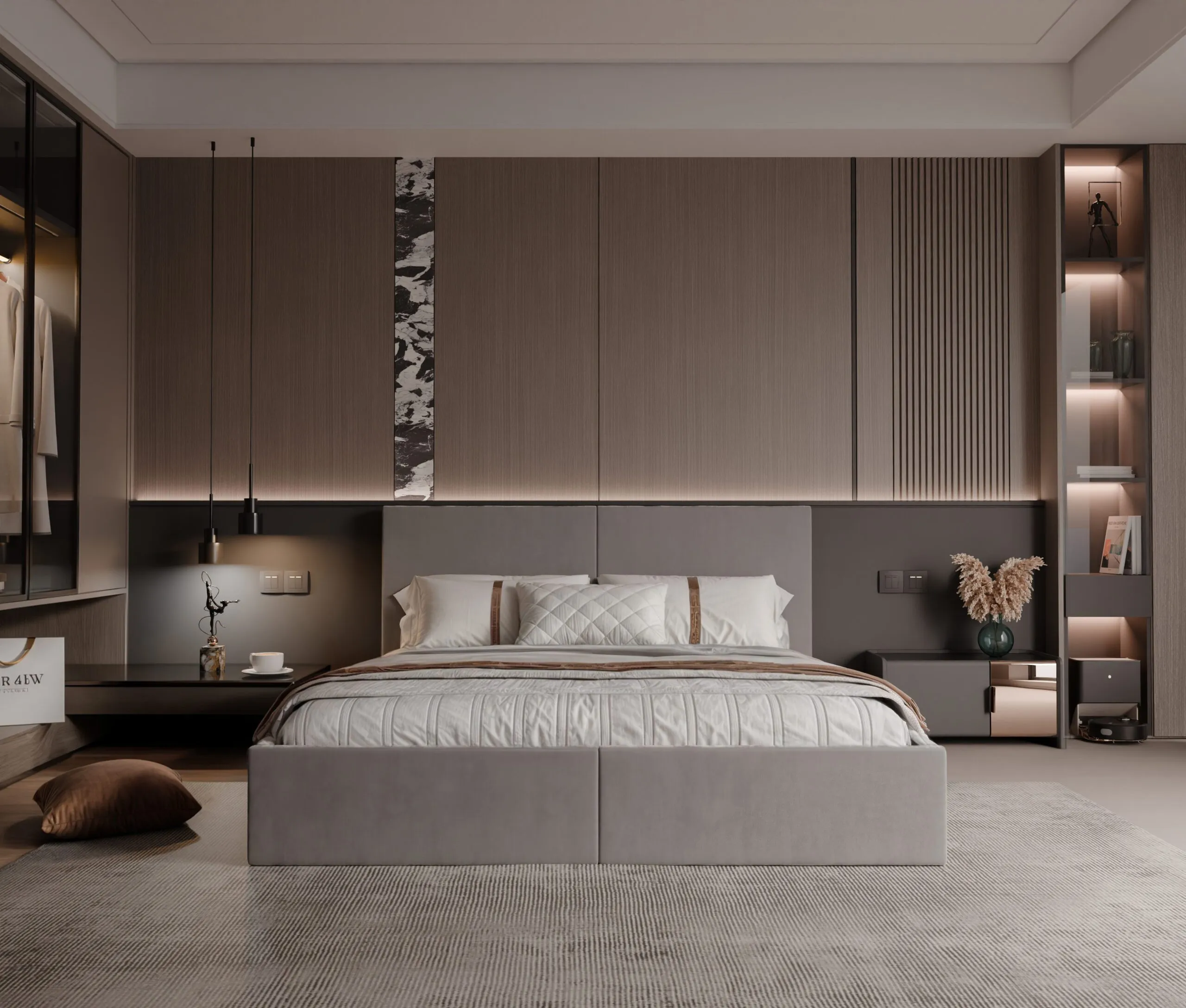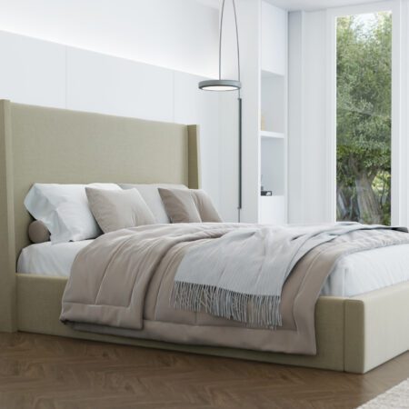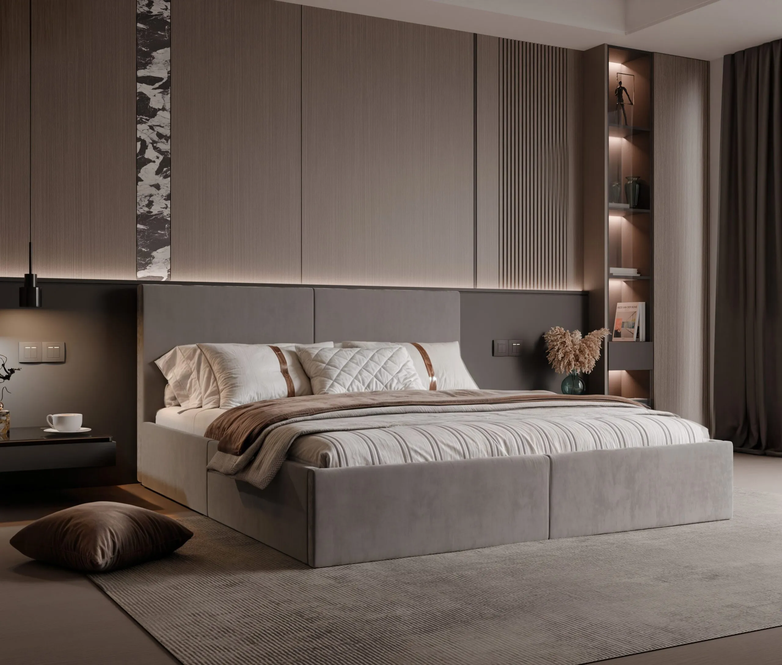 Solidna rama łóżka, elegancka tapicerka, praktyczny pojemnik na pościel – Dzięki wygodnemu mechanizmowi podnoszenia, dostęp do pojemnika jest szybki i łatwy, co umożliwia oszczędne zarządzanie przestrzenią.