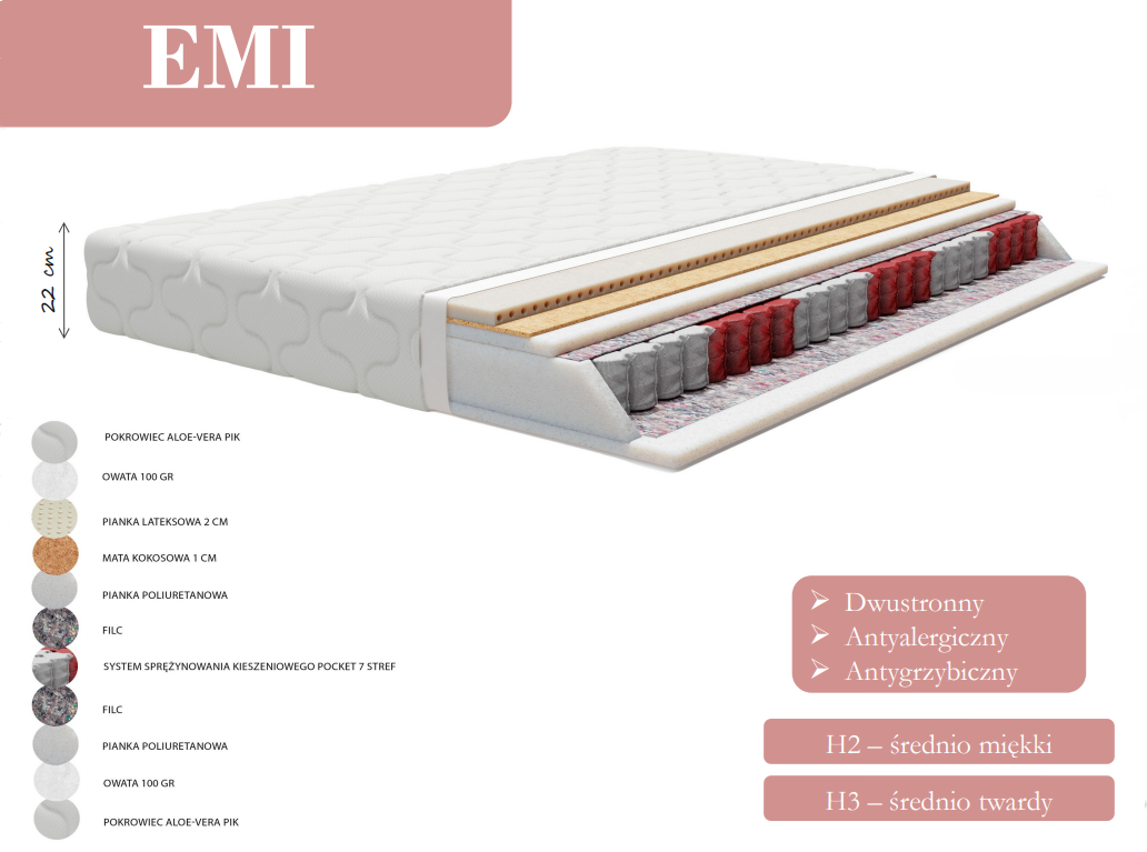 Materac EMI to wysokiej jakości materac, który zapewnia doskonałe wsparcie i komfort podczas snu. Wykonany z naturalnego kokosa i lateksu, które są znane z swojej trwałości i elastyczności. Dodatkowo, materac posiada bonellową kieszeń, która zapewnia bardziej indywidualne wsparcie dla każdej części ciała.